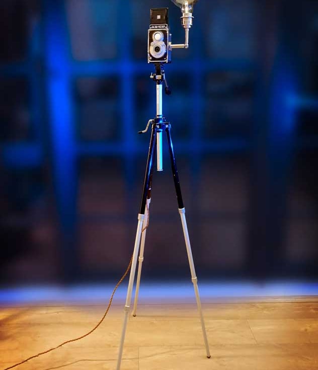 The lamp has an overall height of approximately 162cm. The camera has been fitted with a chrome adjustable light fitting with an large mirrored globe bulb with a vintage Edison style spiral filament producing a lovely warm glow.
