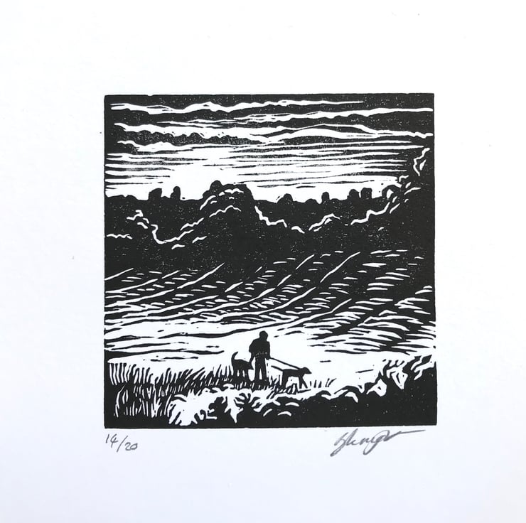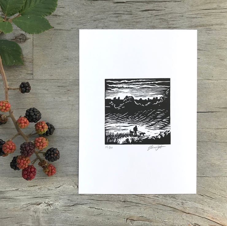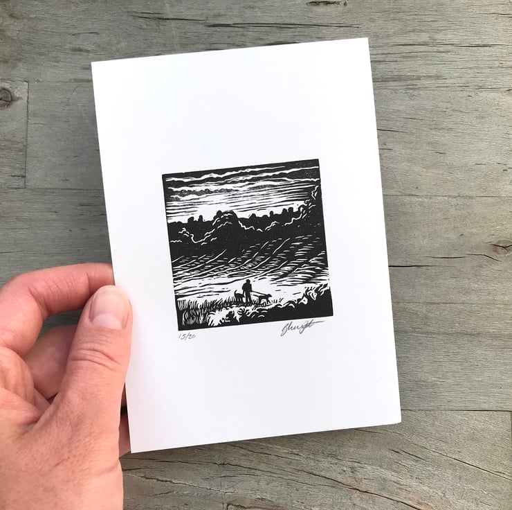 This original, limited edition mini lino cut entitled 'Dog walk' has been hand printed by printmaking artist Beth Knight on archival quality paper using light fast ACMI certified inks. Edition of 20. Hand signed and numbered by the artist. Image size approximately 6x6cm (2.5x2.5inch) on paper size approximately 15x10cm (6x4inch).