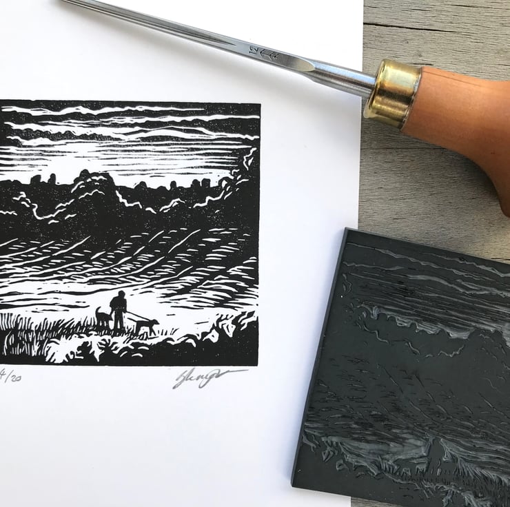 Beth Knight creates small editions of hand printed lino cuts inspired by her local Suffolk scenes and also the wilds of Wales where she grew up. Her images convey the spirit of the natural world and the history and story of the landscape. Dogs and other favourite animals also feature in her work, capturing the movement and character of an individual animal with carefully thought out lines and shapes.