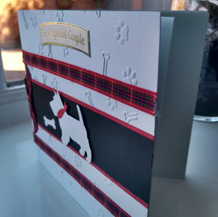 A completely handmade and uniquely designed card consisting of a cute white westie due cut from white card along with a cute scarf and from g none mounted onto black card, red card and then onto quality pristine white card which has been embossed with paws and bones. Finished off with red tartan ribbon and bow and to. Special couple tag