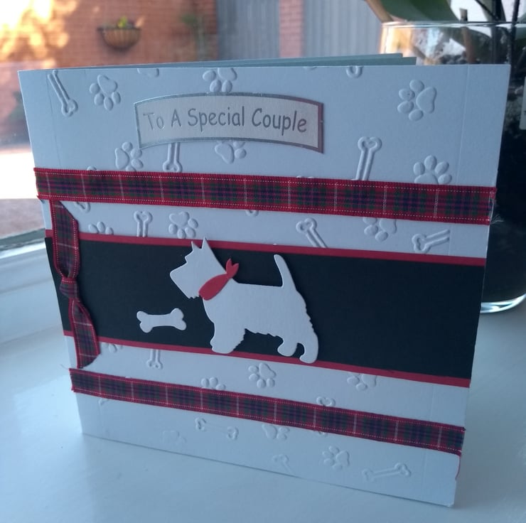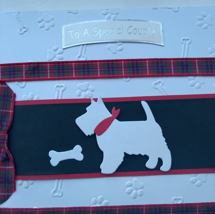 A completely handmade and uniquely designed card consisting of a cute white westie due cut from white card along with a cute scarf and from g none mounted onto black card, red card and then onto quality pristine white card which has been embossed with paws and bones. Finished off with red tartan ribbon and bow and to. Special couple tag