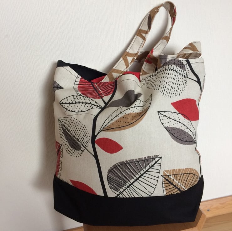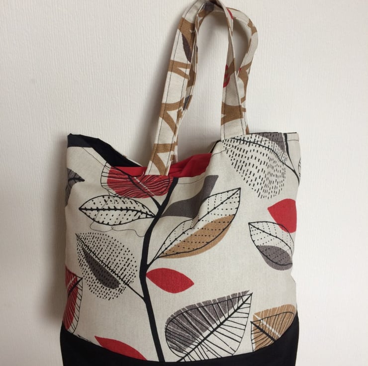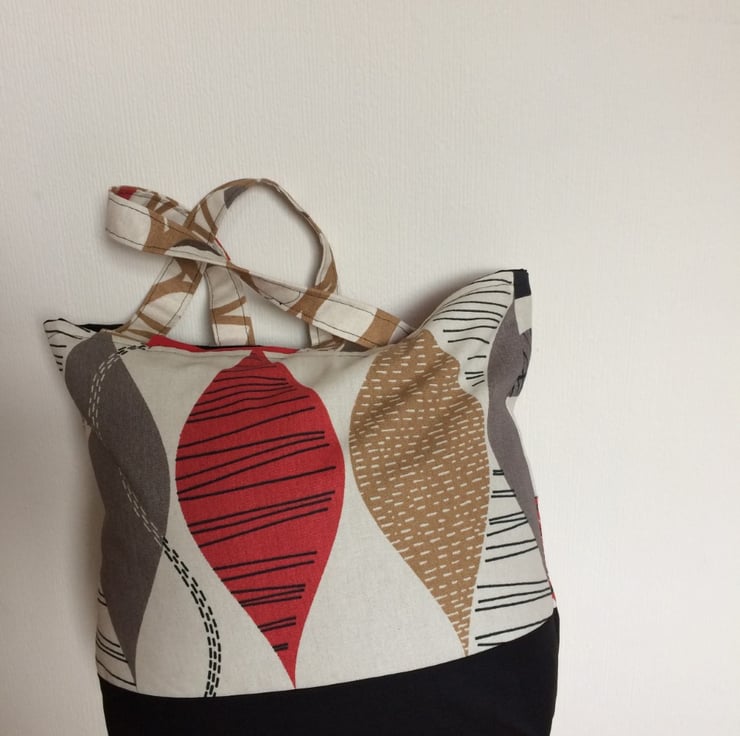 This linen print geometric leaves in Red and black and browns on cream linen , lined in plain black cotton super spacious very modern and has a contemporary look to it . great bag for shopping handles have been reinforced so will take a good weight . this bag has been made from sample pieces of fabric from a swatch book so saved from land fill and re purposed