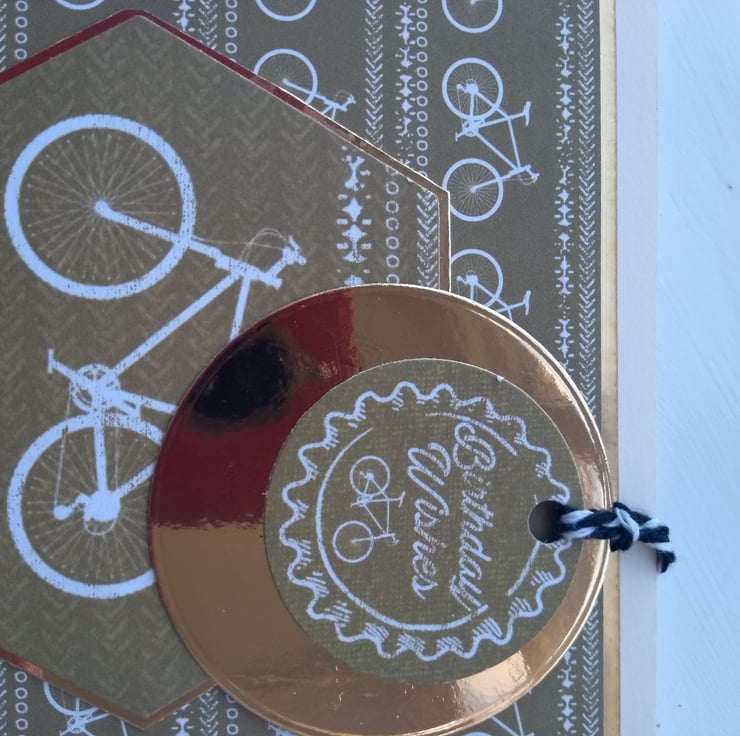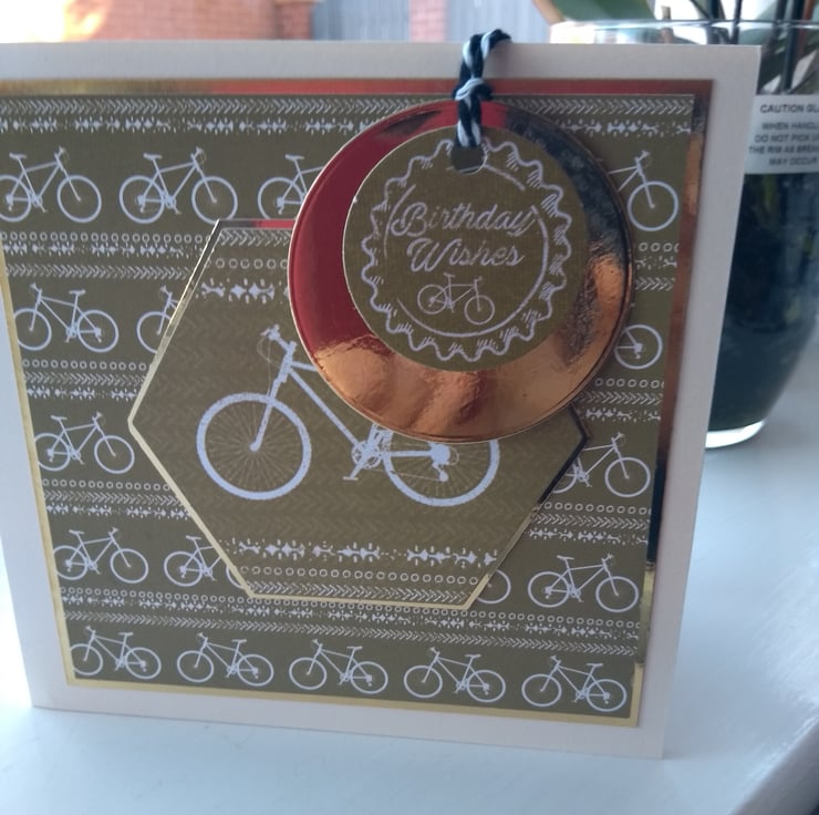 A completely handmade and uniquely designed card. Consisting of cyclist paper which has been made into a topper and mounted onto hold mirri card and then onto quality cream card. Birthday wishes dangles from black and white butchers cord.