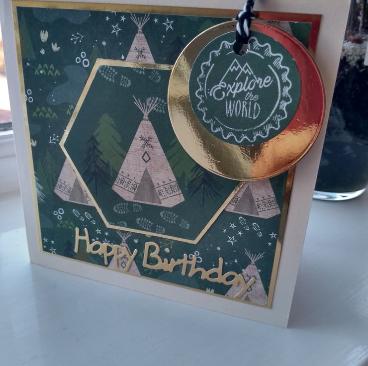 A completely handmade and uniquely designed card. Consisting of camping printed paper made into a topper and mounted onto hold mirri card then onto quality cream card. Explore the world dangles by black and white butchers cord. Finished off with happy birthday due cut from gold mirri card