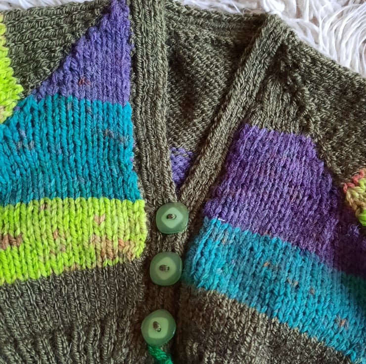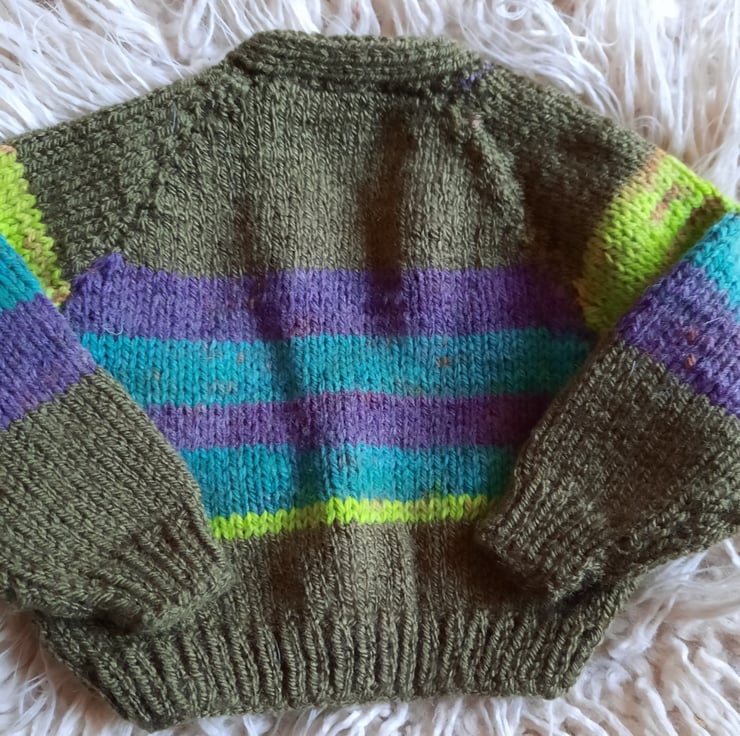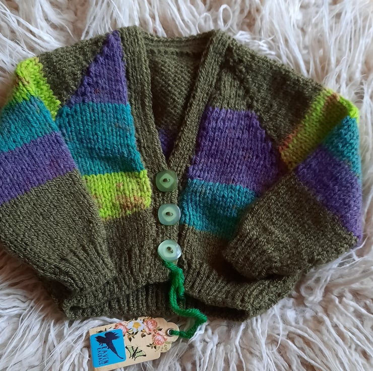 A beautiful blend of countryside colours for this cute little hand knitted cardigan. To fit newborn to 3 months with a 16inch chest, back length 8 inches and sleeve length 5.5 inches. Blends of moss green, leaf green and dark purple make a very stylish little cardigan which fastens with 3 shiny green buttons. I have used soft snuggly yarn in 75% acrylic and 25% wool for easy care wash at 30 degrees centigrade.