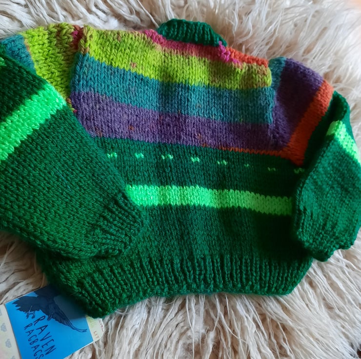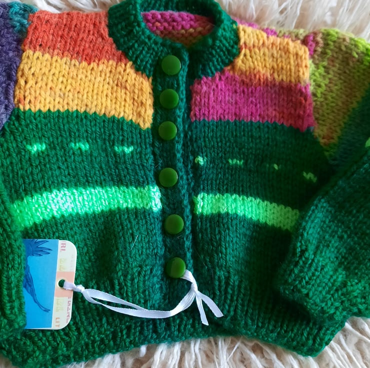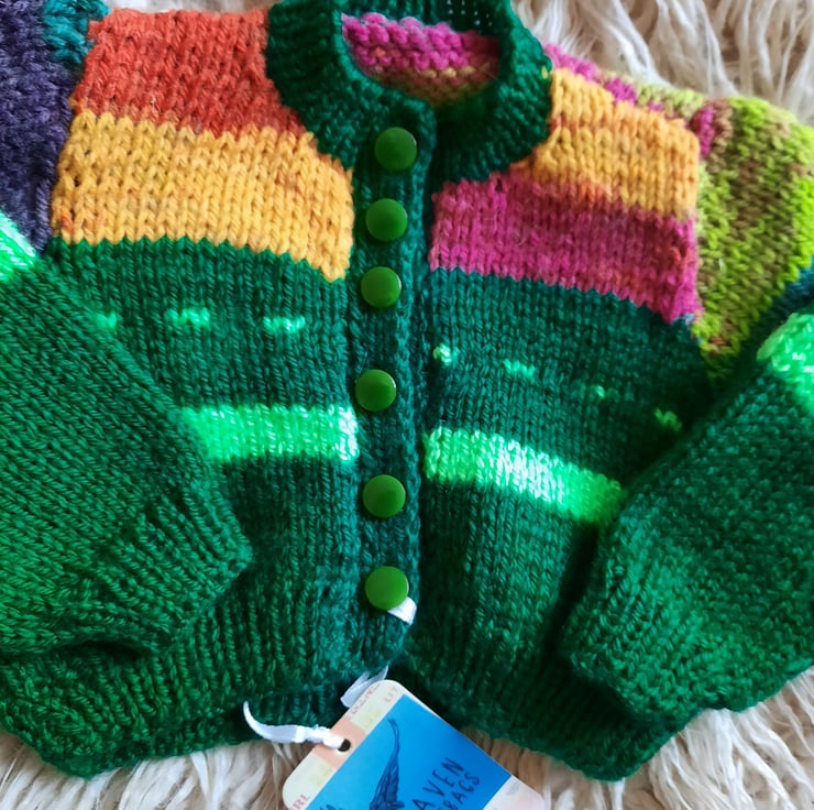 Bright beautiful colours blended together to make a fabulously stylish and original baby cardigan. The perfect gift for your newborn
