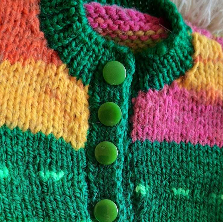 very pretty contrast of rich dark green with the jewel colours of Fushia pink, burnt orange and golden yellow and just a splash of lime! This little handmade cardigan fastens with 6 deep green buttons and has a round neck . to fit chest 16 inches back length 7.5 and sleeve length 5.5 inches. Knitted in soft 75% acrylic and 25% wool for easy care wash at 30 degrees centigrade.