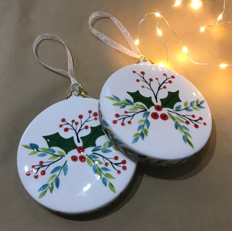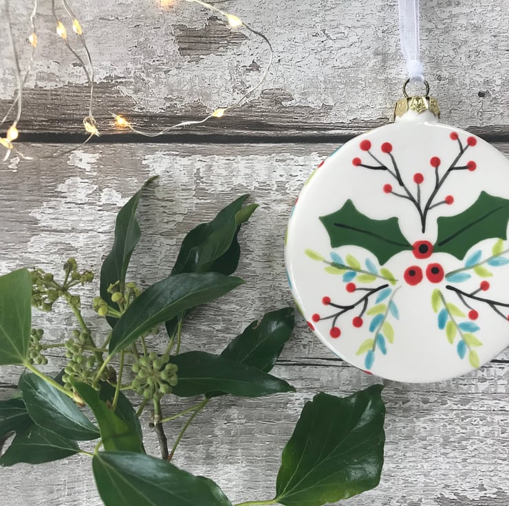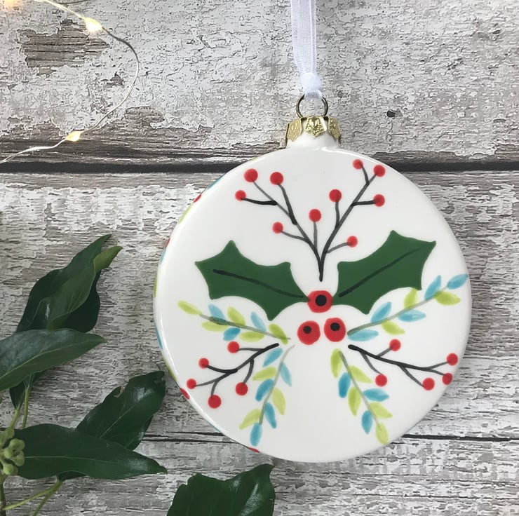 A beautiful hand painted flat bauble with a holly and berries design painted on both signs and a hand painted leaves and berries wreath painted around the rim of the flat bauble.