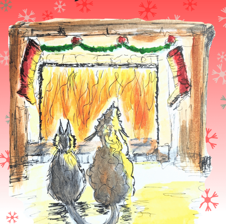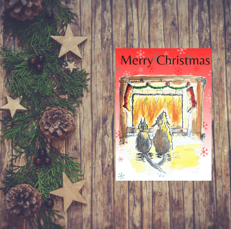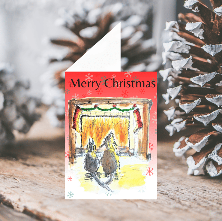 This is an A6 christmas card, printed from an ink and watercolour illustration. It features a Bedlington Terrier dog, and a black cat, sitting in front of the fire, being mesmerised by the flames and waiting for Christmas.