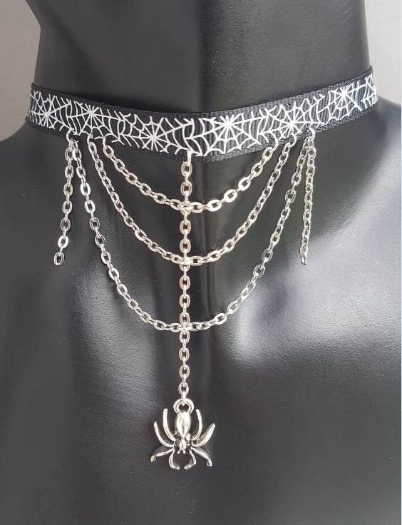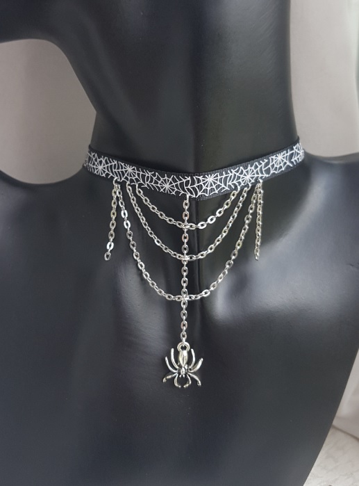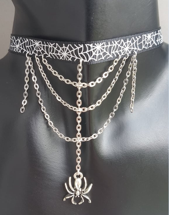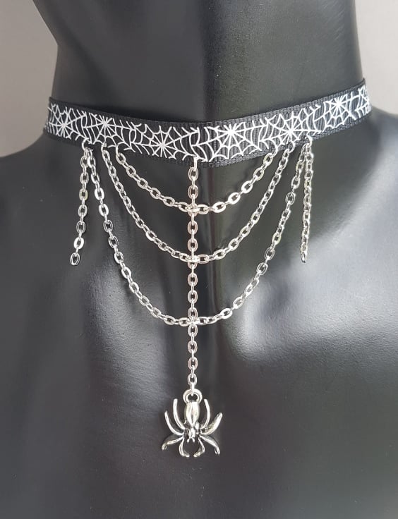 A gorgeous spooky spider charm and silvery chains dangle from a Spiderweb design Grosgain ribbon. A creepy cute necklace, fab as a gothic gift or for Halloween. Ribbon fastens with a trigger clasp and ring.