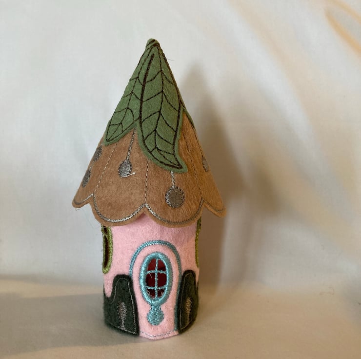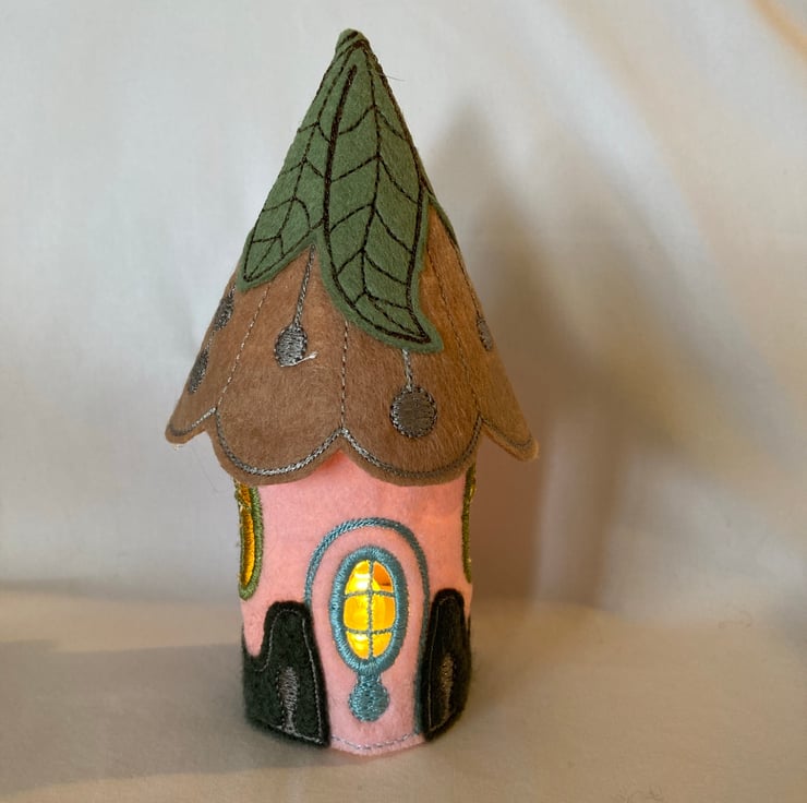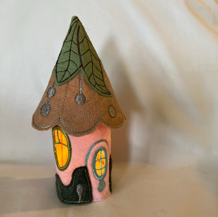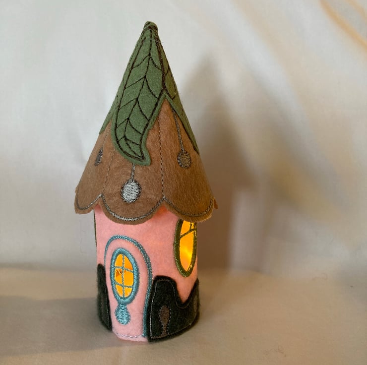 Cute Embroidered fairy tea light house. Uses battery tea light, not real flame. A new battery tea light is provided. Perfect for a nursery, night light, child’s room, home ornament. Goes perfectly with the larger fairy houses. When lit, gives a soft glow. 5 ins high, 1.75 ins base diameter, 2.5 ins, diameter roof.