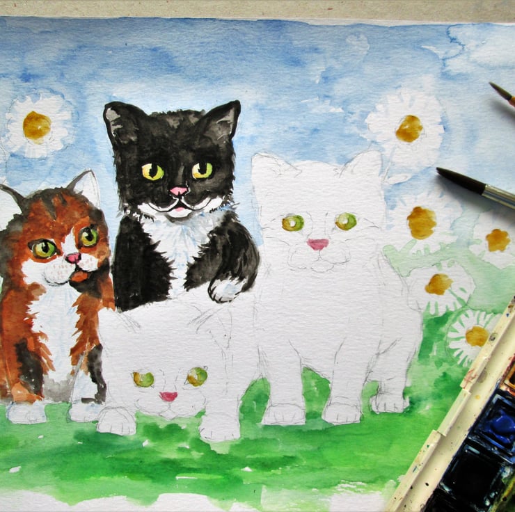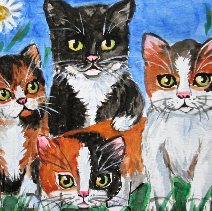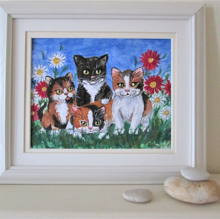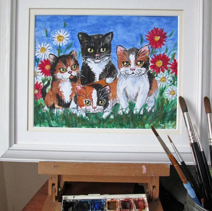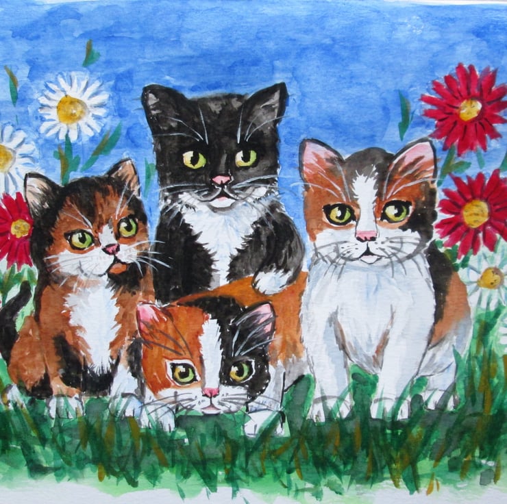 An original watercolour painting of four sweet kittens and flowers. Kitten Foursome in flower garden.