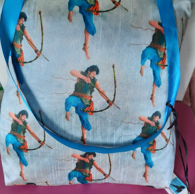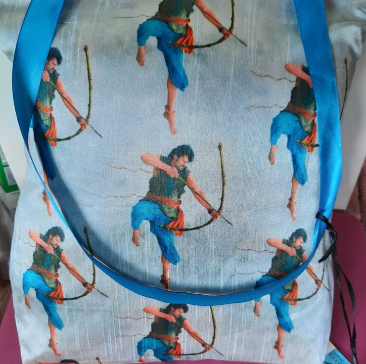 A beautiful vibrant design of a leaping archer on a shimmering delicate pale grey silk background for this very lightweight bag with deep blue ribbon shoulder straps. Fully lined with pale grey polyester lining. The bag measures 29cm wide by 30cm deep. Very practical for travelling as it rolls up for popping into your luggage and feels light as a feather!