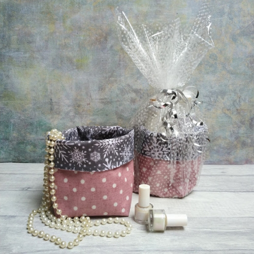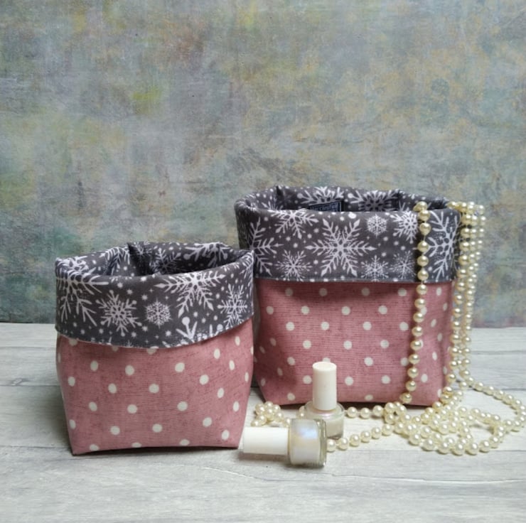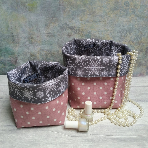 Stylish and useful, these storage baskets have been made using matt PVC coated cotton (oilcloth) in a pink polka dot design on dark grey and have a snowflake print polyester cotton lining.