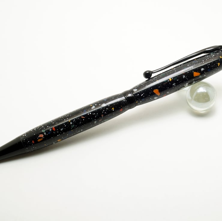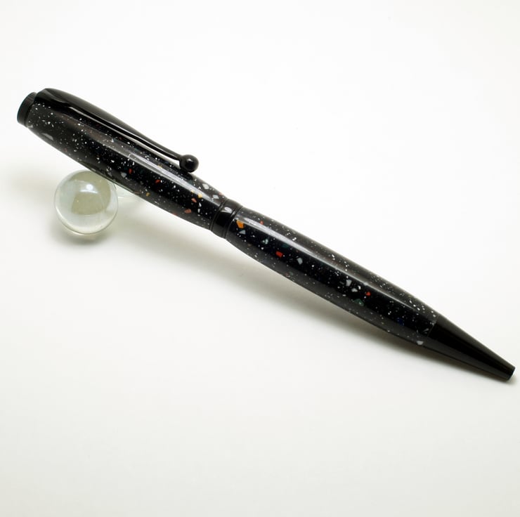 This pen was handturned by me in my workshop in suffolk, the metal parts are a black chrome finish, Included in the price is a black card presentation box & Protective velvet sleeve