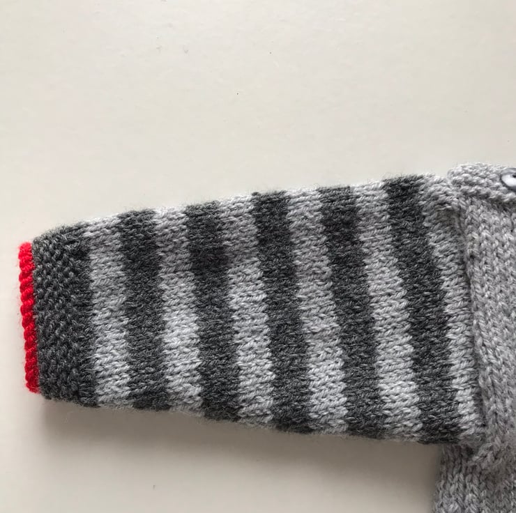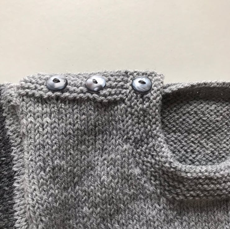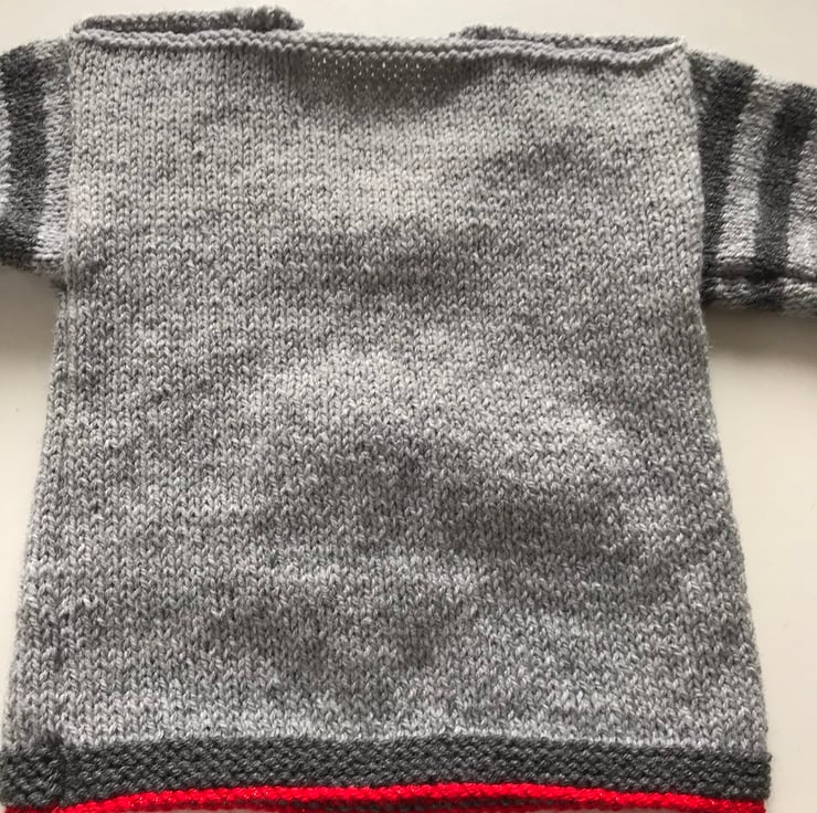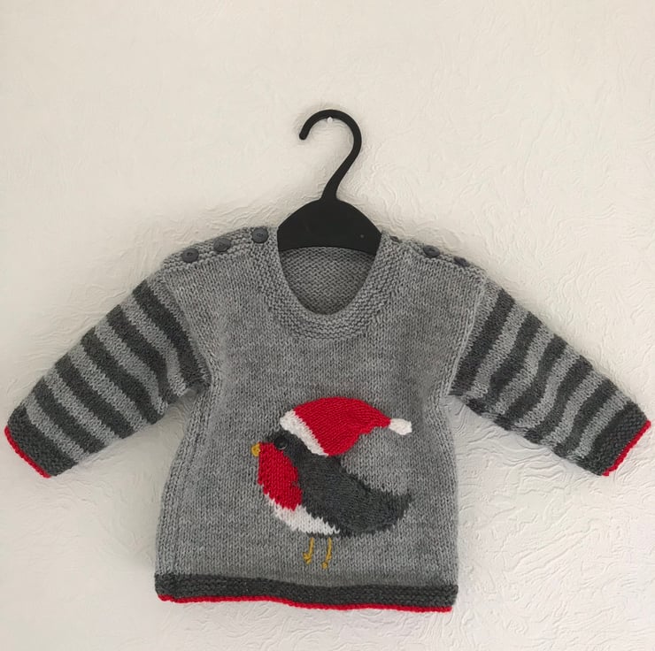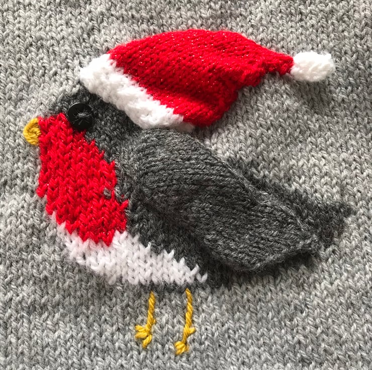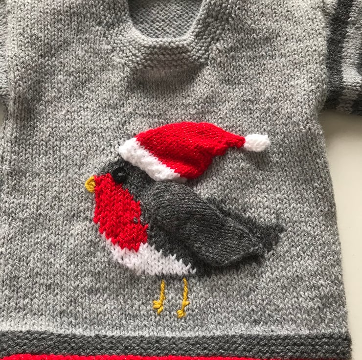This jumper with a robin on the front is hand knitted in a premium acrylic yarn. The main body is worked in a platinum grey with darker grey hems and stripes on the sleeves. The edging is worked in a sparkly red yarn. The robin is worked in dark grey and white with a sparkly red breast and hat. It fastens on the shoulders with buttons and a button is used for the eye of the robin.