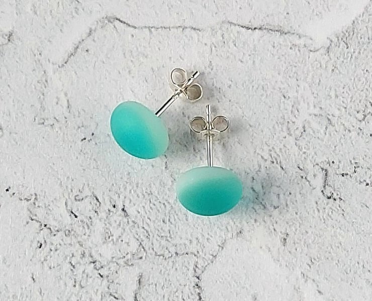 A pair of handmade fused glass stud earrings in a bright fresh aqua colour, with a smooth tactile matt finish and sterling silver fittings.