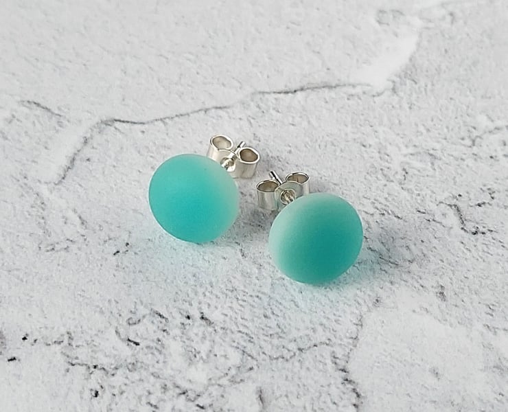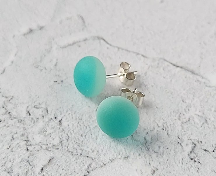 A pair of handmade fused glass stud earrings in a bright fresh aqua colour, with a smooth tactile matt finish and sterling silver fittings.