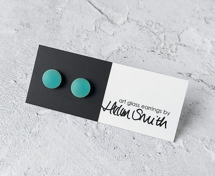Stud earrings in matt aqua fused glass with sterling silver fittings, handmade by me in my home studio on the Wirral peninsula, NW England and presented on my signature card.