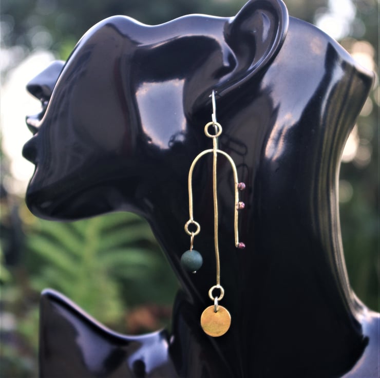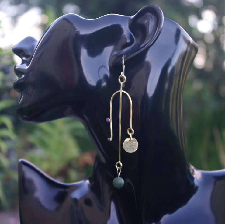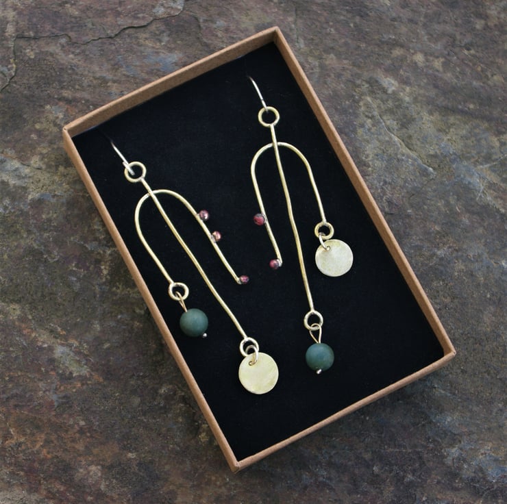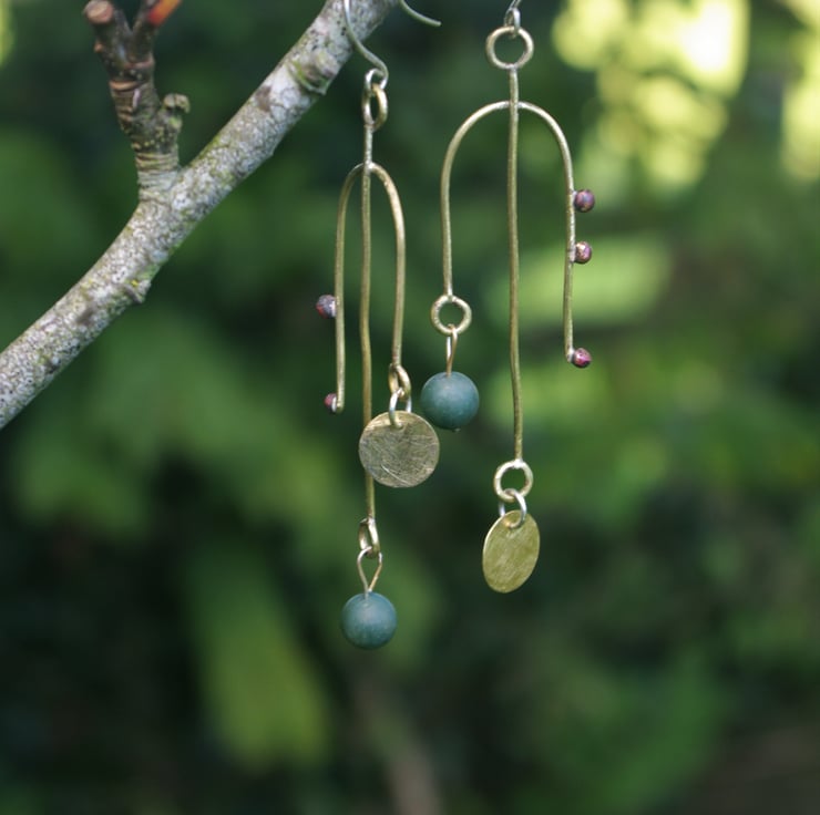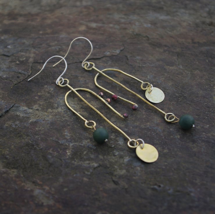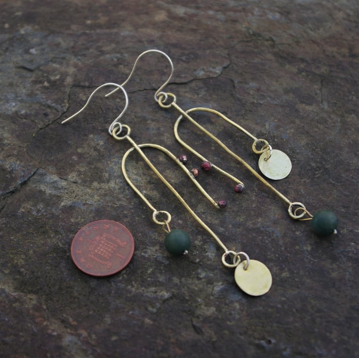 Very long dangle brass earrings ready to make a grand but subtle statement . A round green, matt, agate bead hangs from a different point on each earring m as well as brass discs with a matt texture. To complement these shapes and colours, I have soldered round copper spheres to the other side of the brass arc shape. There are 2 blobs on one side and 3 on the other.