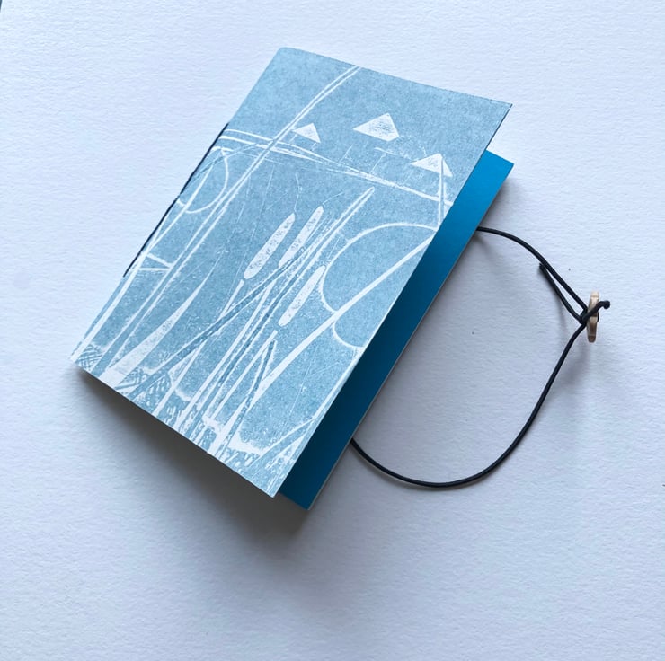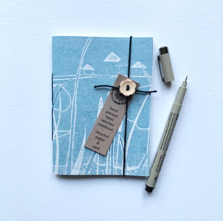 This soft backed pocket sized notebook measures approx 14cm by 10.5cm and features a hand printed outer cover in a dark Prussian Blue. The print is taken as a relief print from my original Collagraph plate Towards Fitzwilliam Cottages, which are a beautiful row off old farm cottages near where I live.