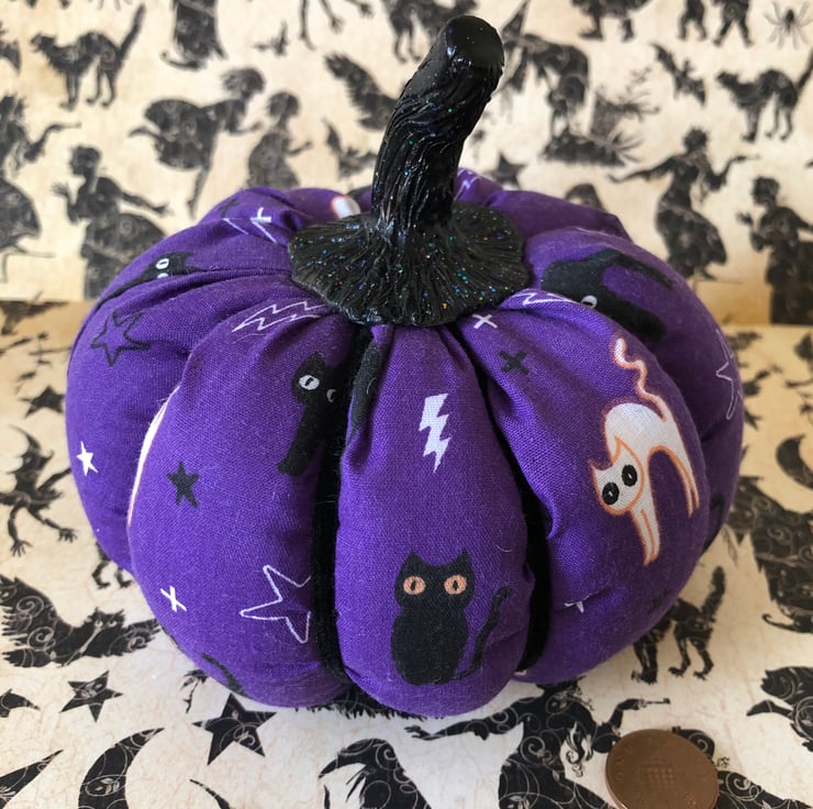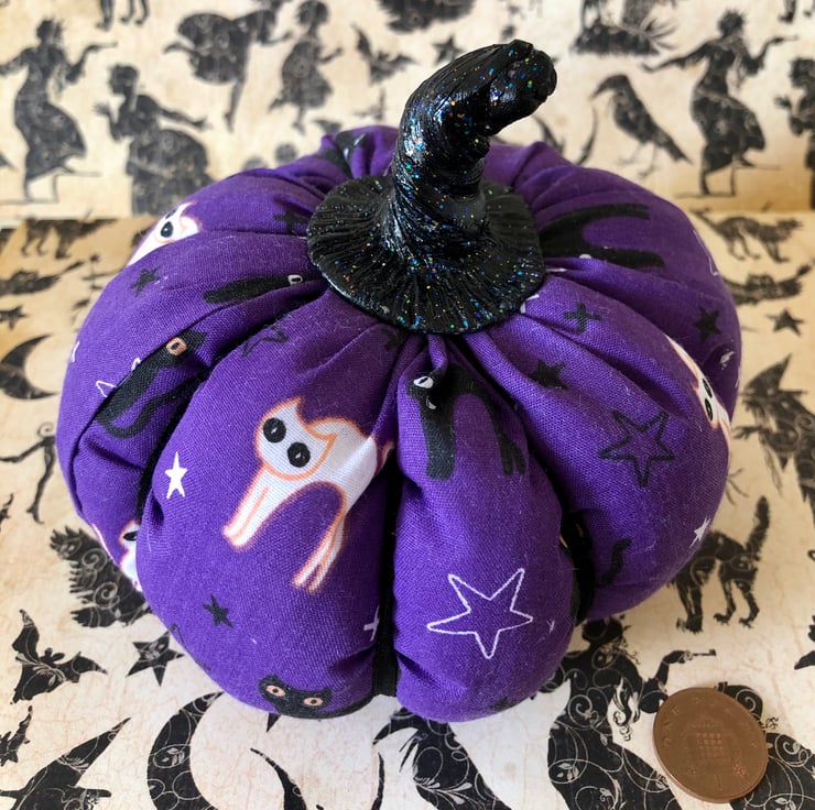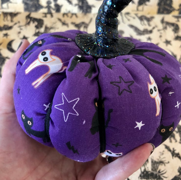 Purple cotton pumpkin with a lovely black and white witches cat print.