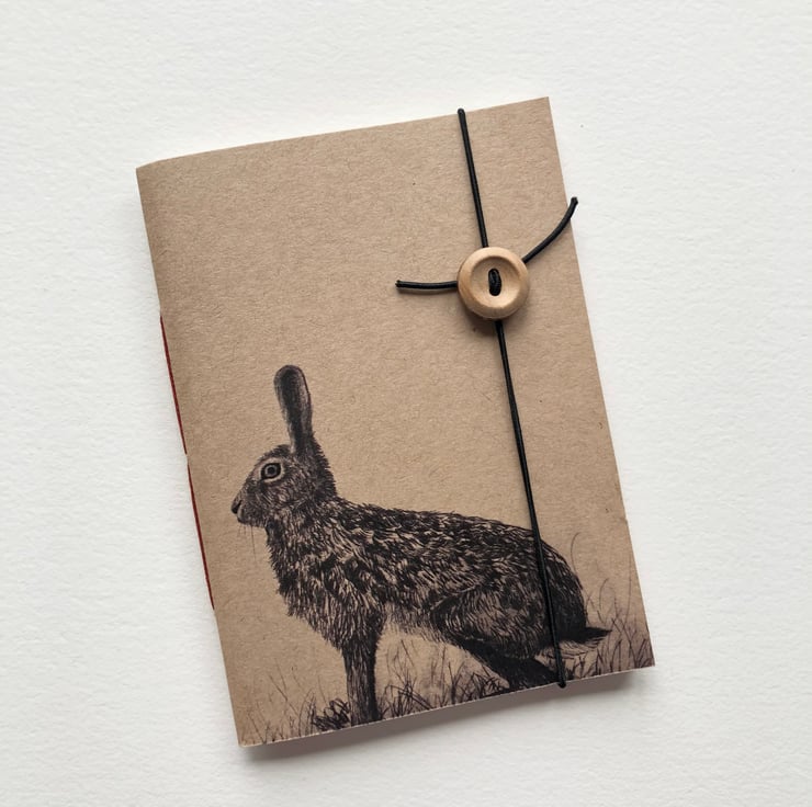 This soft backed pocket sized notebook measuring approx 14cm by 10.5cm and features a digitally printed image in black of my original Hare drypoint print, The Watchful Hare.