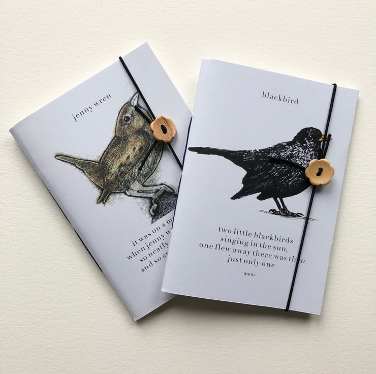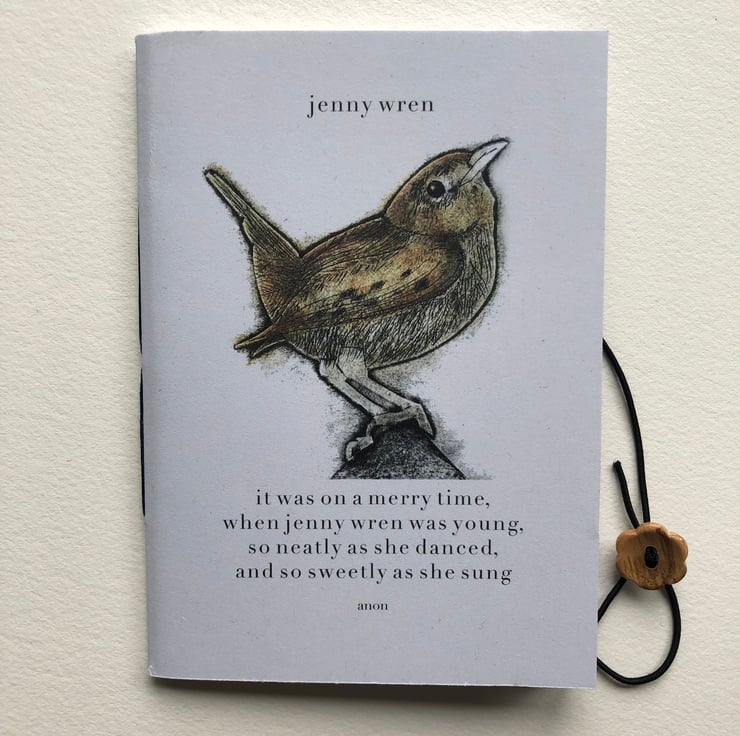 This soft backed pocket sized notebook measuring approx 14cm by 10.5cm features a digitally printed image of my original Collagraph print, Jenny Wren.