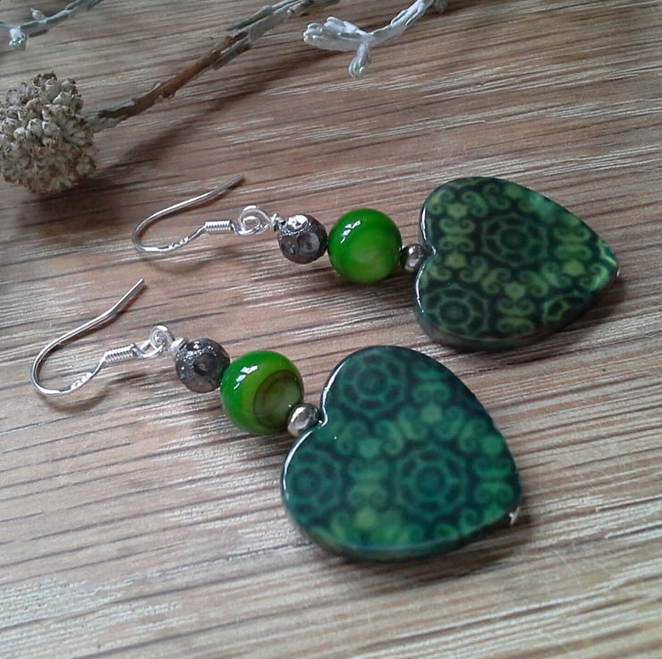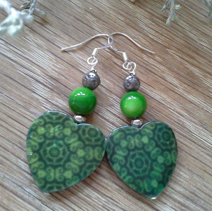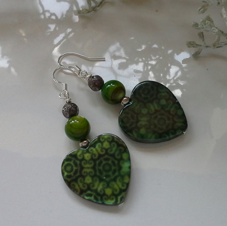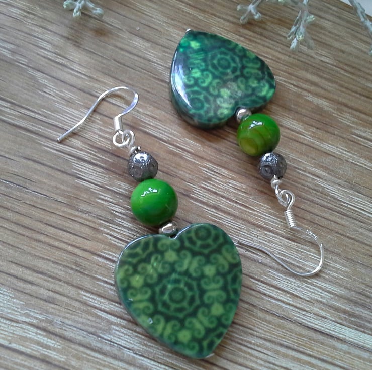 A pretty pair of earrings designed and hand crafted using quality professionally printed heart shaped genuine mother of pearl with green mother of pearl round dyed beads and decirative gun metal colour copper beads, They are ideal for everyday wear to frame the face adding a touch of seasonal colour. All other components are quality 925 sterling silver ear wires (stamped).