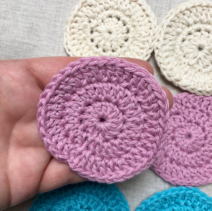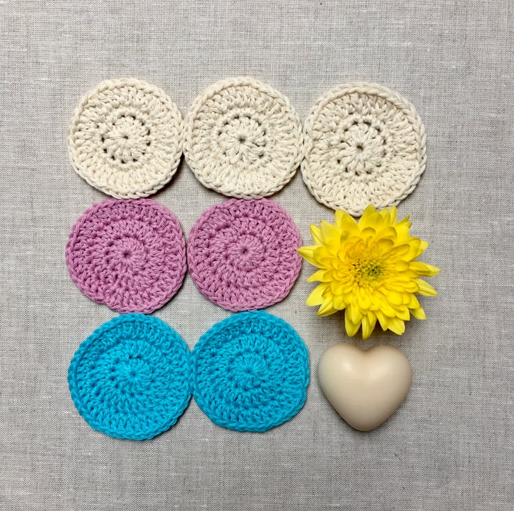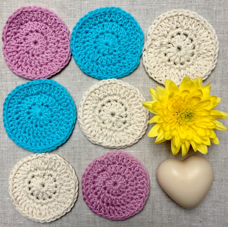 They are hand crocheted from 100% soft cotton yarn so each one will be unique. Each pad measures approximately 7cm in diameter.