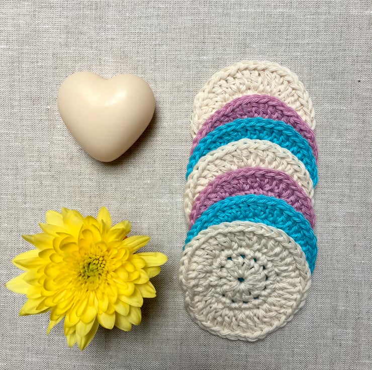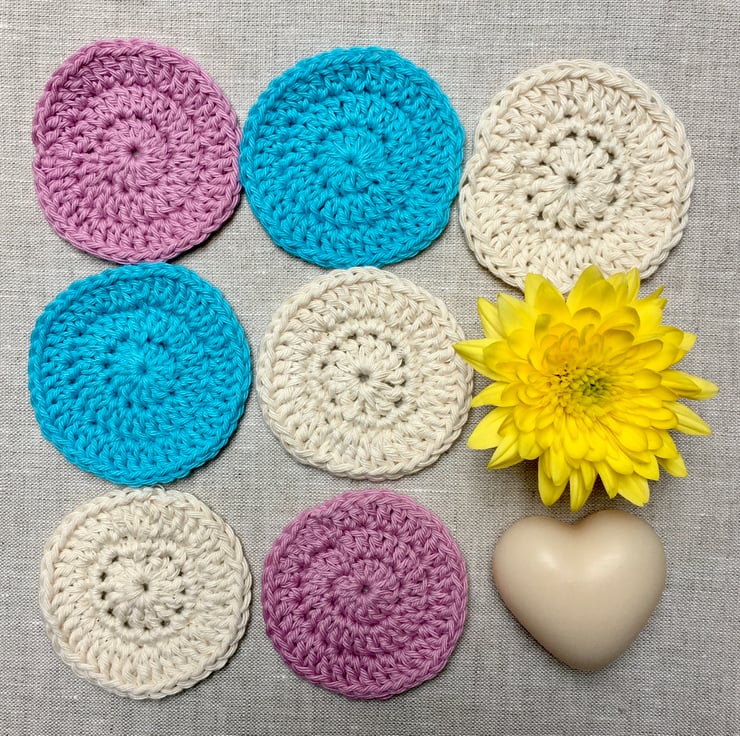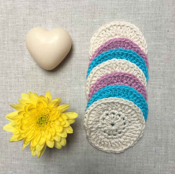 A set of seven eco and vegan friendly crocheted reusable cotton face scrubbies. A great alternative to disposable makeup wipes and face pads.