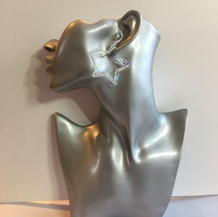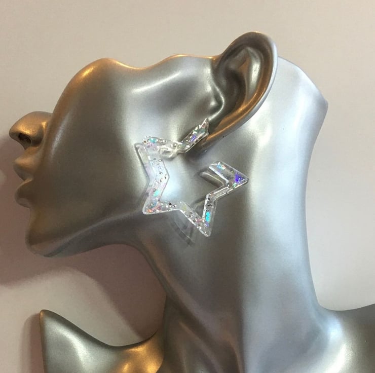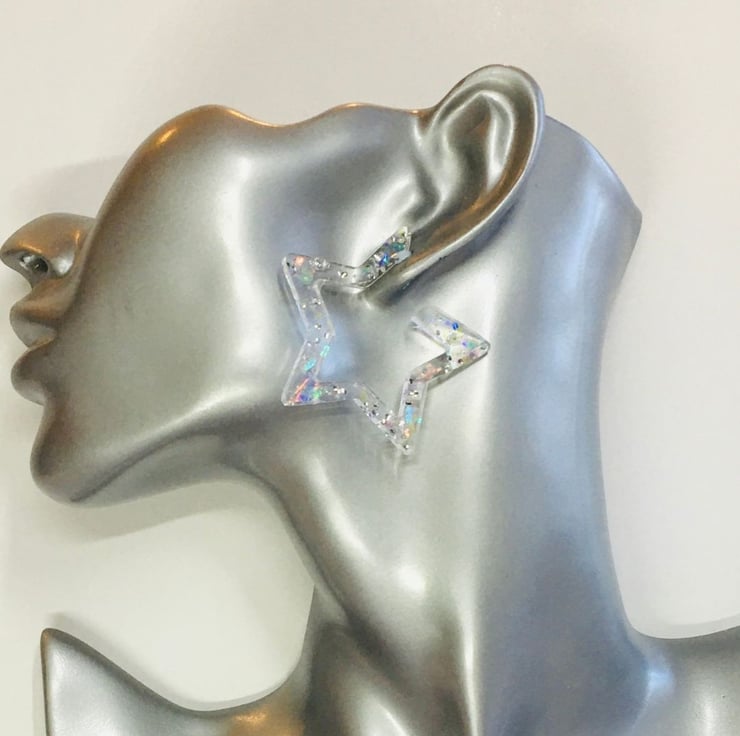 I have added an iridescent sparkly mica powder to the resin mix to create a wonderful shimmery effect on these star hoop earrings.