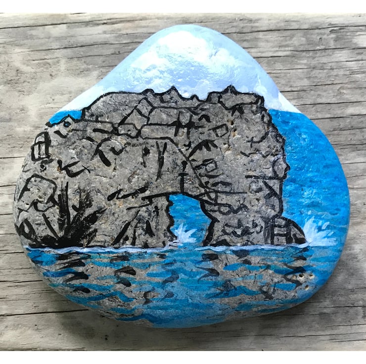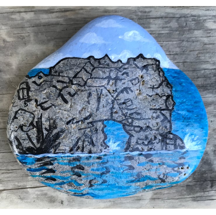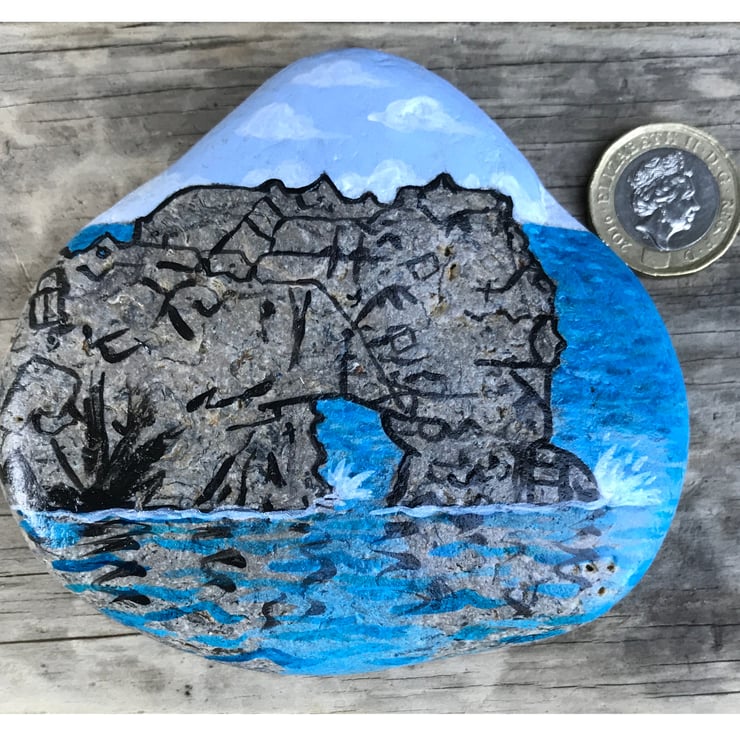 A simple image of the world famous arch of Durdle Door painted on a sea-worn beach stone. The arch of Durdle Door is painted wit black lines to indicate form and structure, but the natural stone is left to represent the stone of the arch.