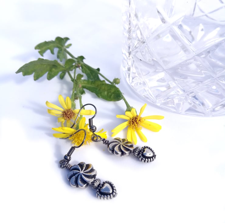 Simple and elegant in design; sporting a heart bead and a bead depicting a swirling sun rays, hand approximately 4.5 cm.