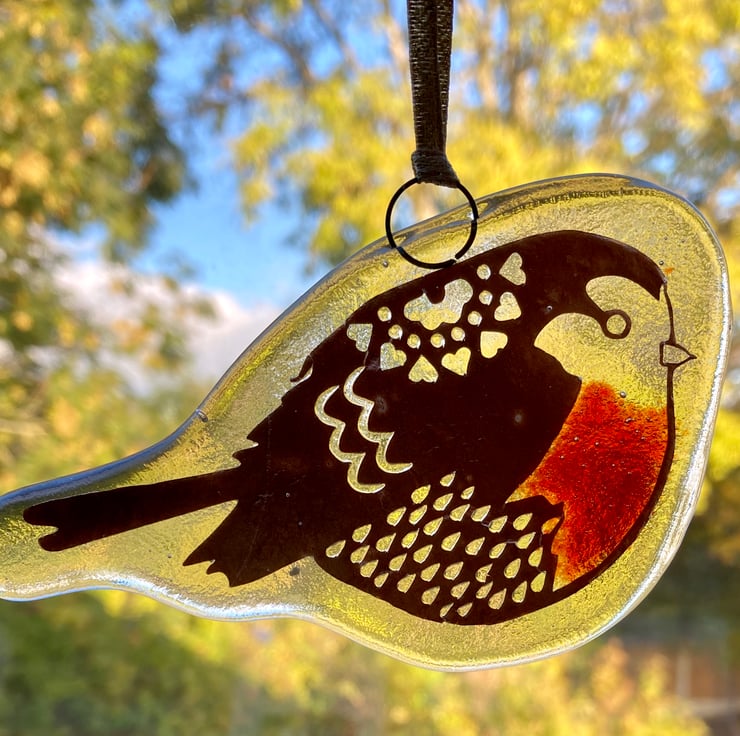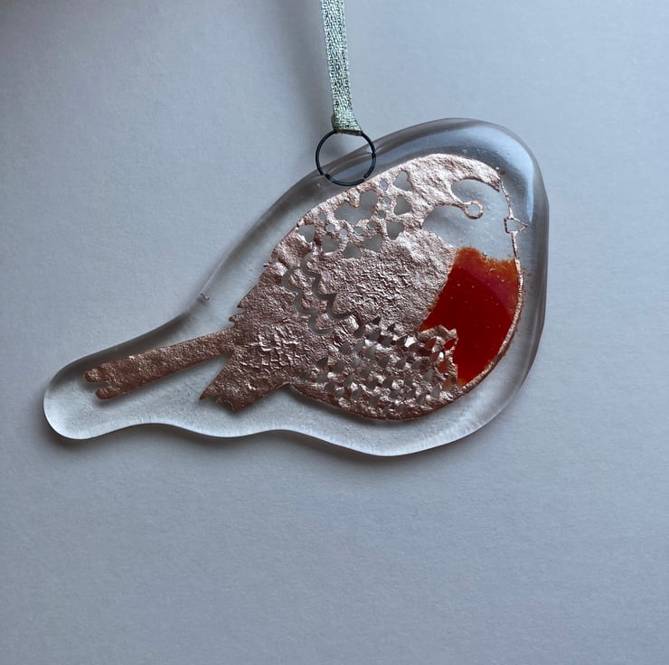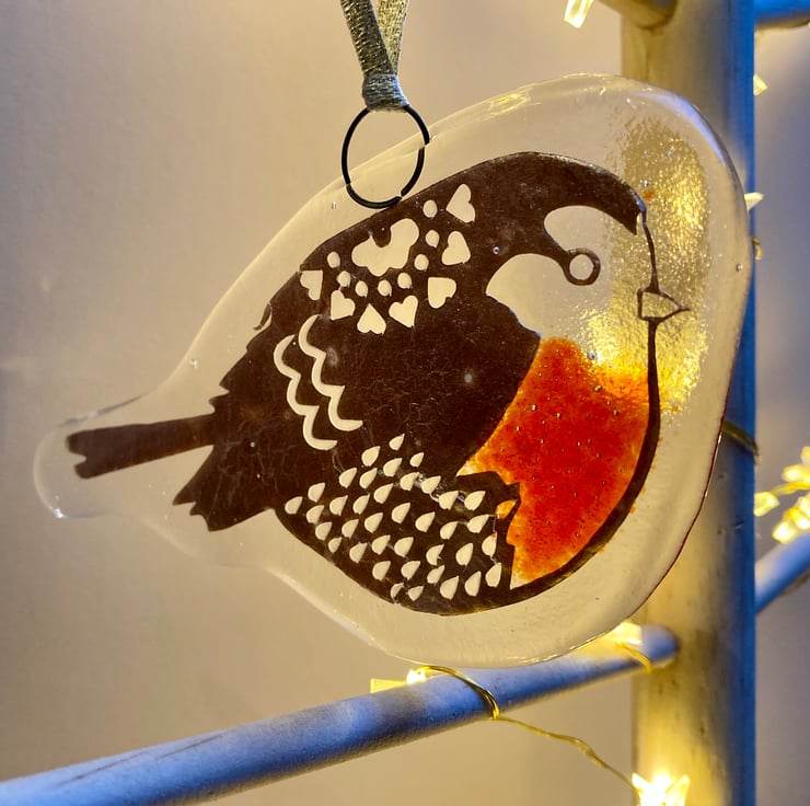 Beautiful robin red breast handmade from bullseye glass. This is an ideal Christmas gift.