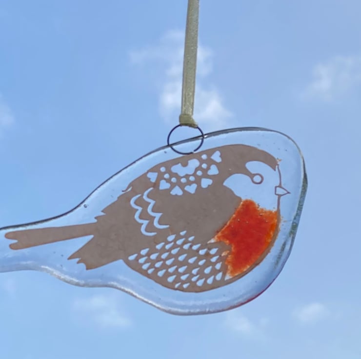 Each robin is made from metalic mica and red powdered glass. Then fused between two handcut layers of clear glass and fused together within a kiln to approx 800c.