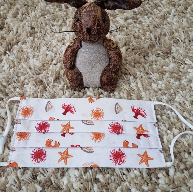Adult face covering made from an under the sea print on pale pink cotton. The face mask is made with 2 layers of cotton forming an inner pocket for a filter (not included) and is fastened over the ears with 2 loops of elastic and a toggle adjuster.