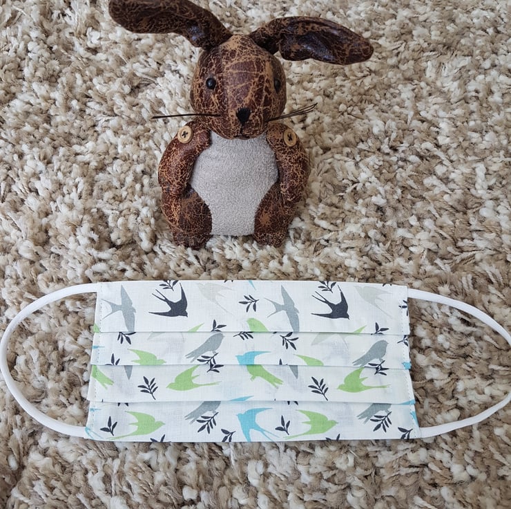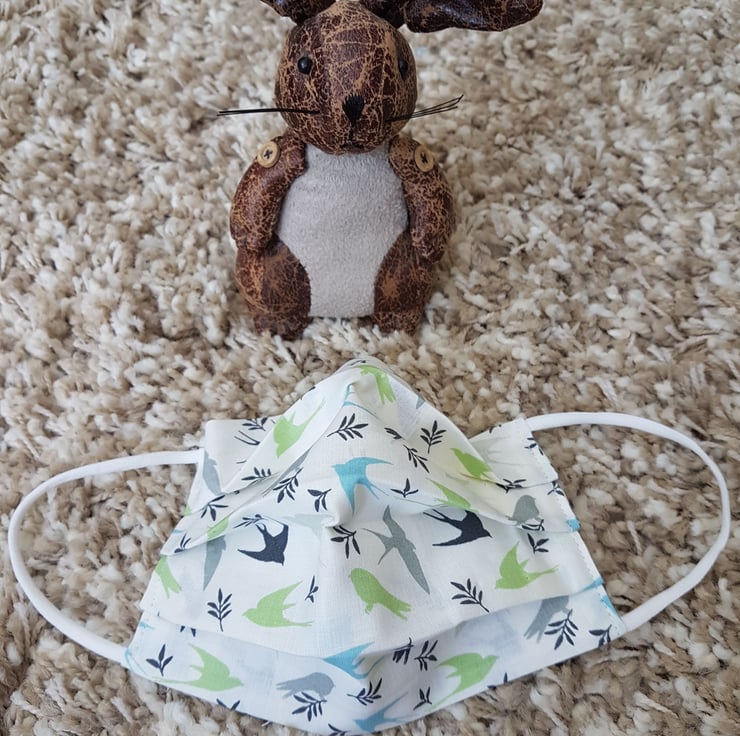 Adult face covering made from a mixed bird print on ivory cotton. The face mask is made with 2 layers of cotton forming an inner pocket for a filter (not included) and is fastened over the ears with 2 loops of elastic and a toggle adjuster.