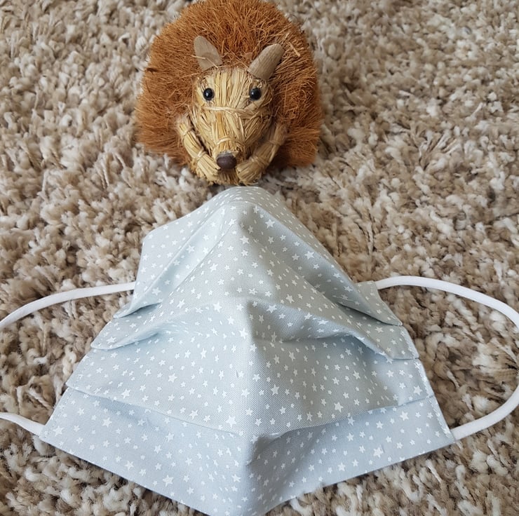 Small Adult/Teenager face covering made from a tiny white star print on grey cotton. The face mask is made with 2 layers of cotton forming an inner pocket for a filter (not included) and is fastened over the ears with 2 loops of elastic and a toggle adjuster.