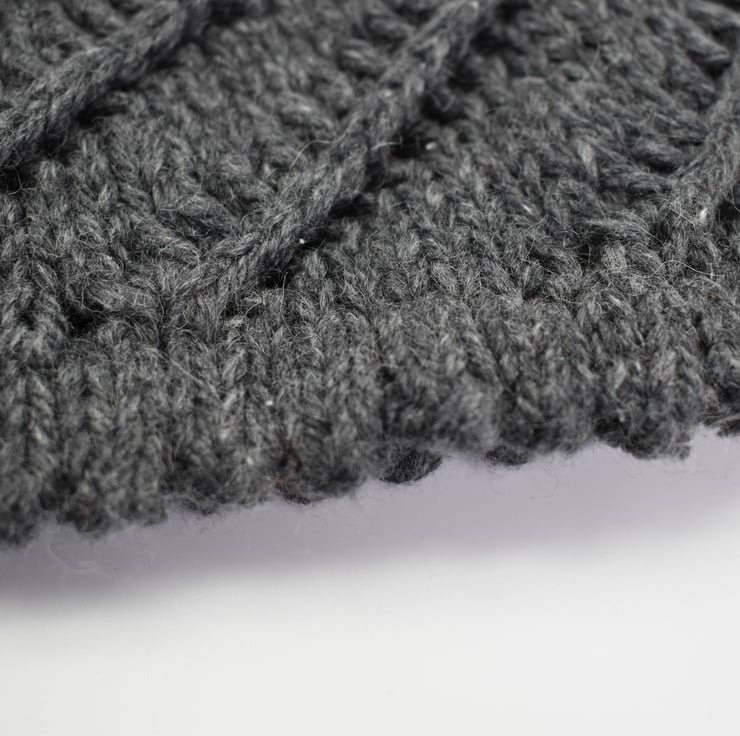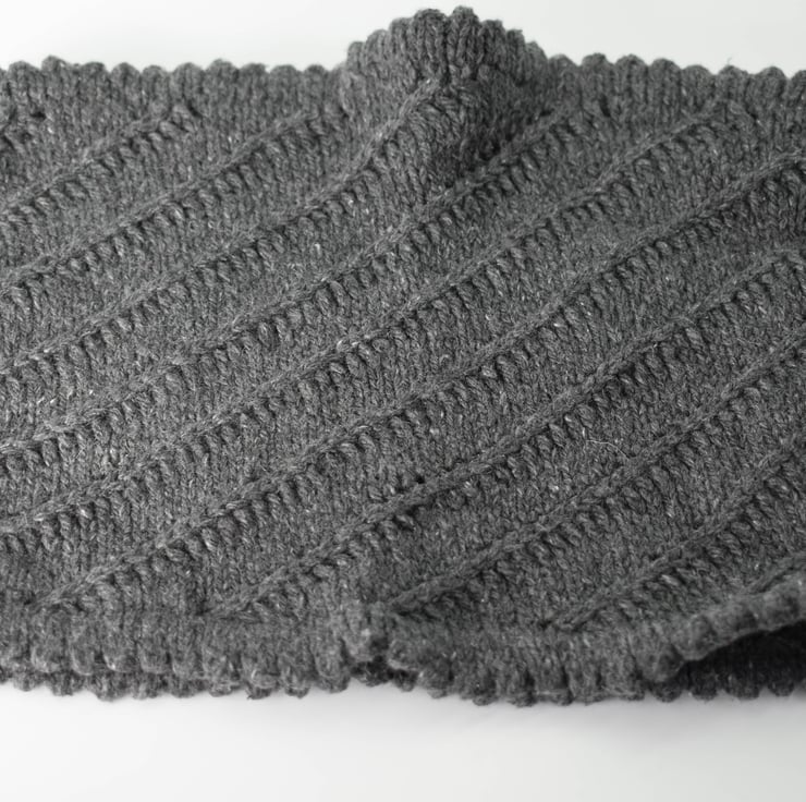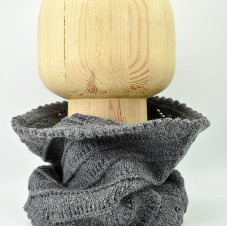 This cosy and stylish dark grey cowl has been hand knitted from luxuriously soft aran weight yarn in a pretty spiral design and finished with a picot edge top and bottom.