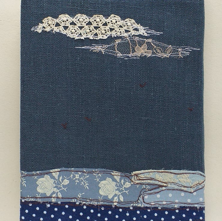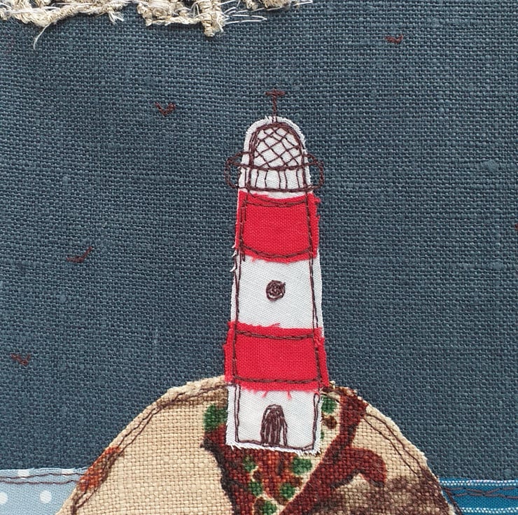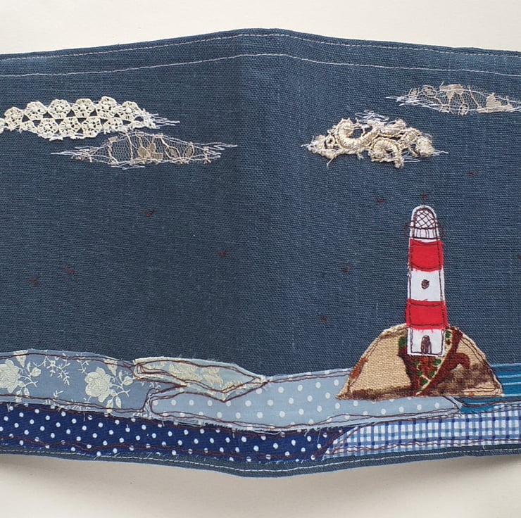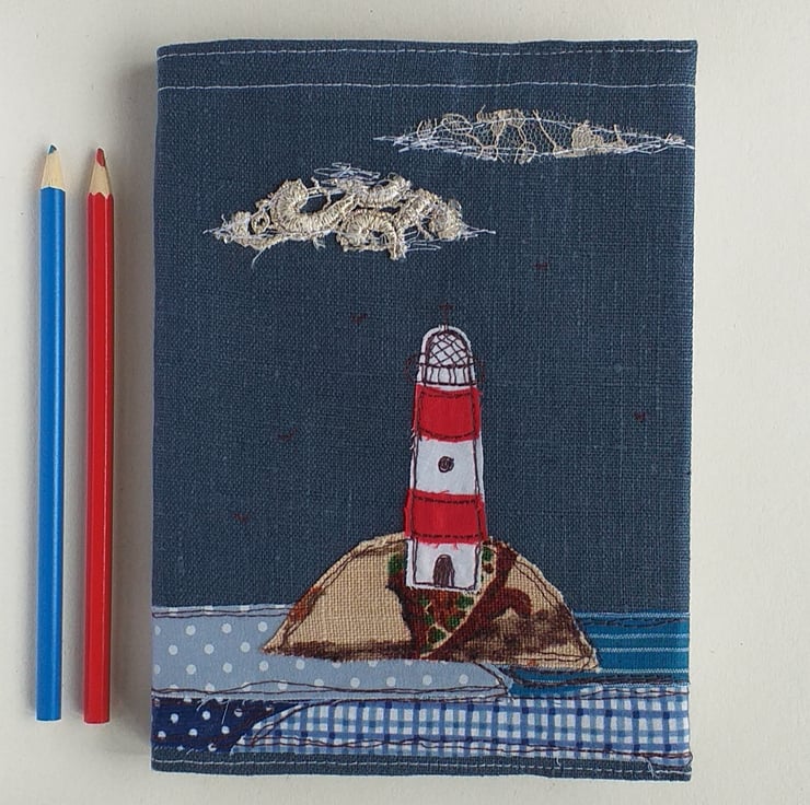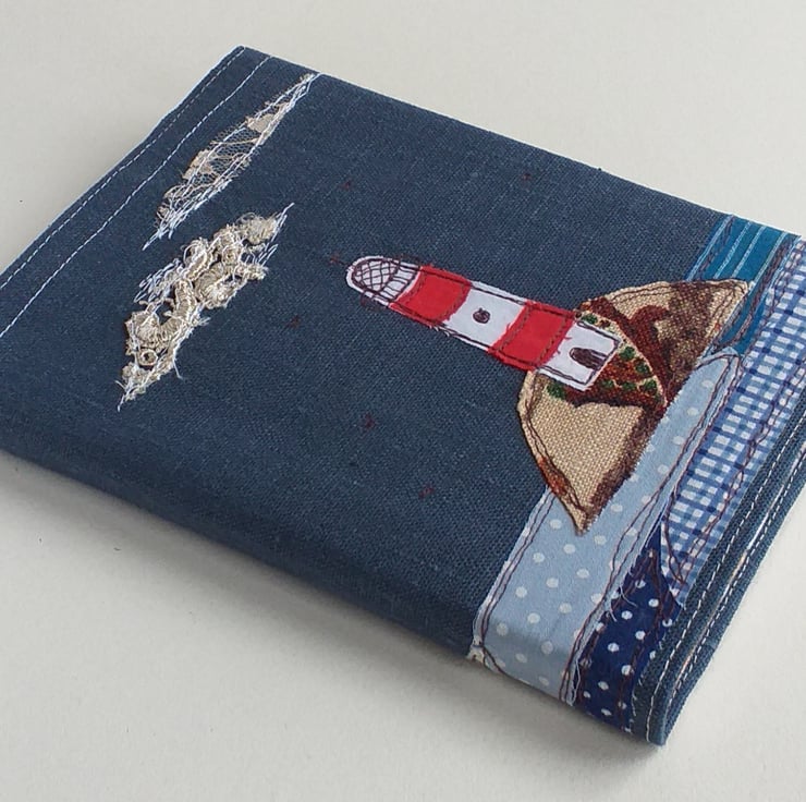 This A5 hardback blank page notebook has a removable cover in blue linen featuring a seascape with lighthouse in freestyle machine embroidery. The design continues on to the back cover and is made using appliqued fabric scraps.