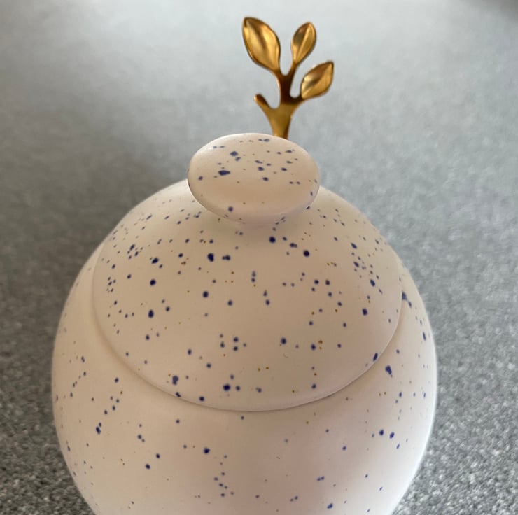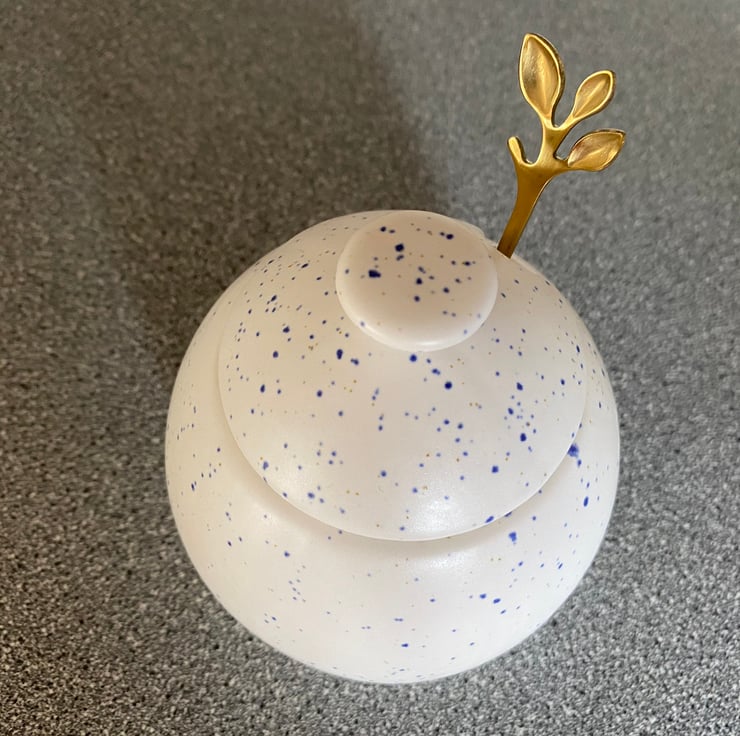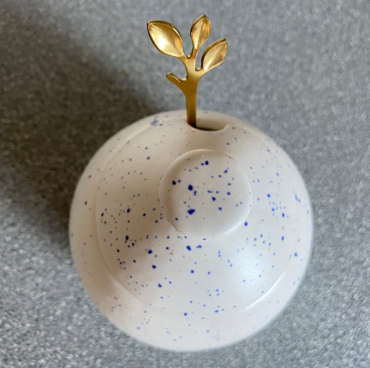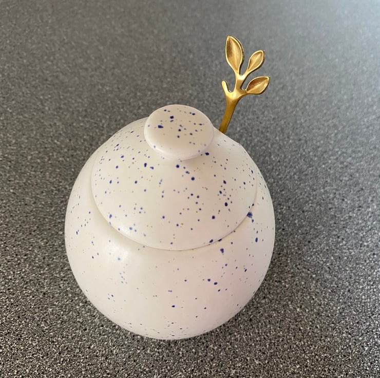 This glazed ceramic sugar bowl with matching lid and a stainless steel gold leafy spoon is the perfect addition for any kitchen table. Handcrafted with all of the care and attention that you would expect from an artisan. These sugar bowls are individually hand glazed and fired in my own electric kiln in Somerset, England and not mass produced in a factory in a far away land..!