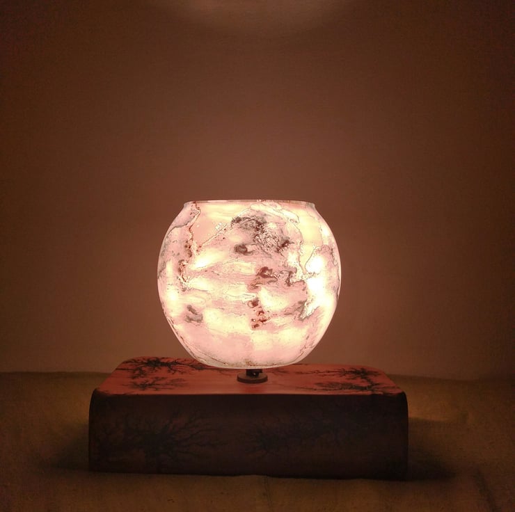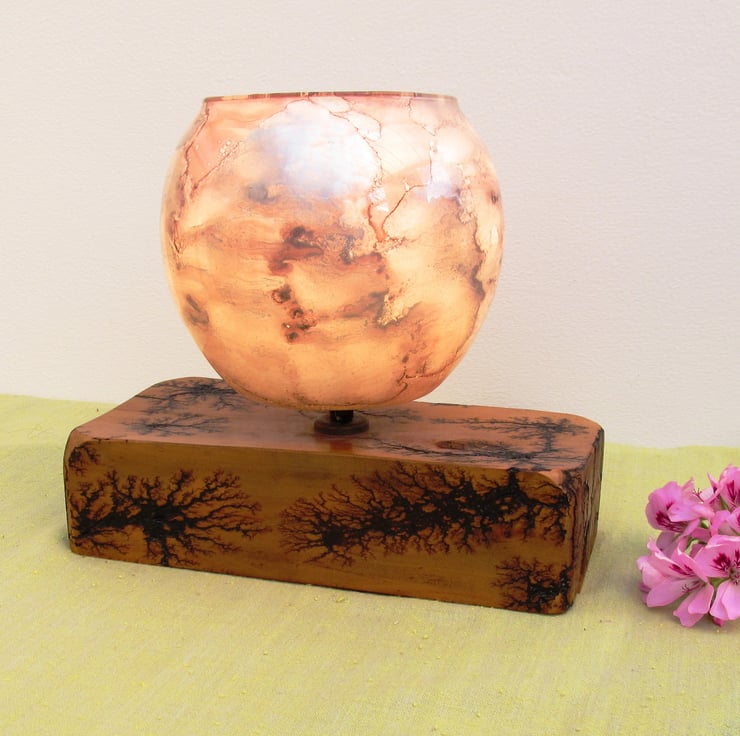 Handcrafted from a gorgeous piece of yellow hawthorn and finished with handmade glass shade.