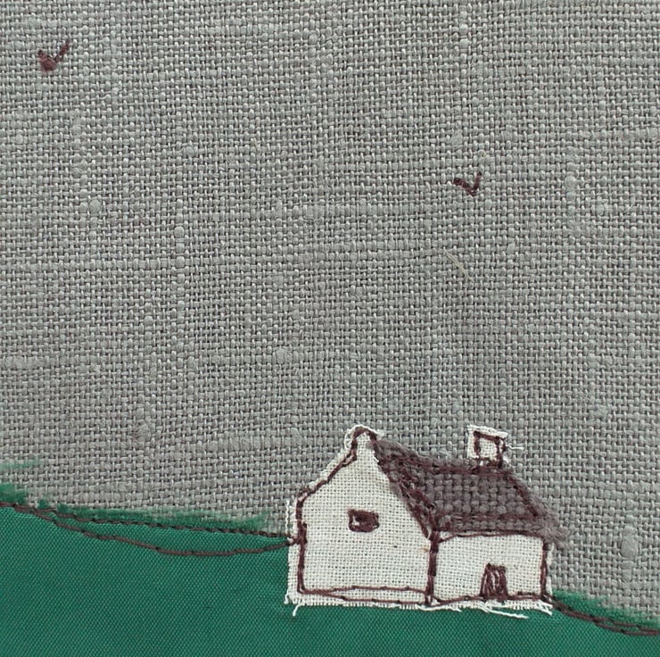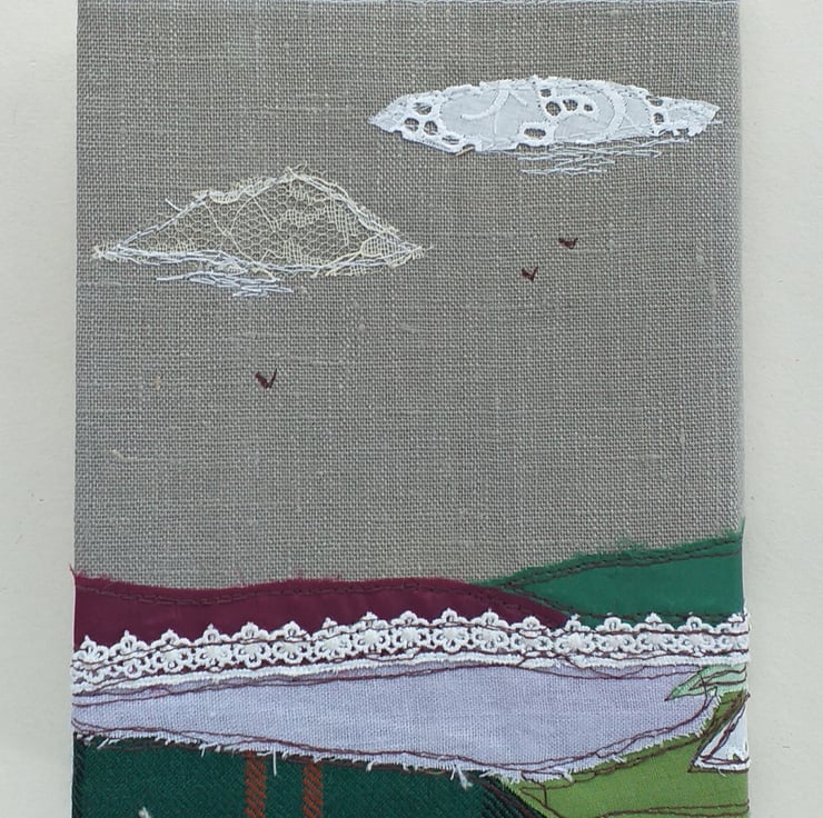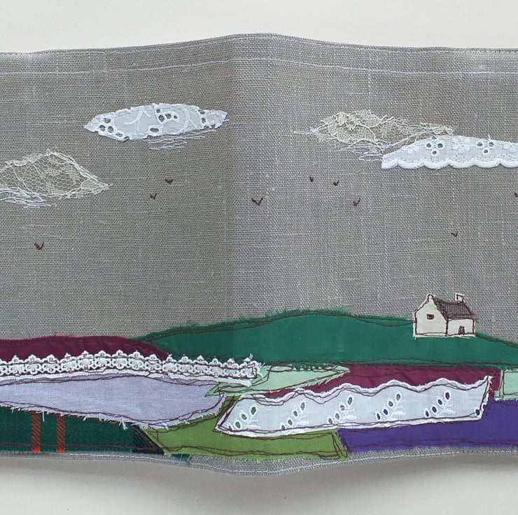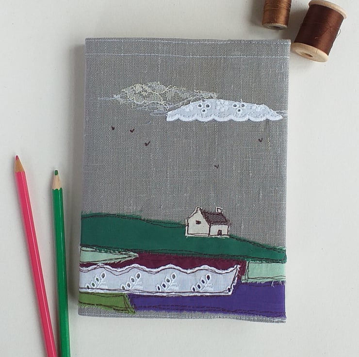 This A5 hardback blank page notebook has a removable linen cover featuring a croft in a Scottish heathery landscape. The design is made using fabric scraps with freestyle machine embroidery, and the landscape continues on to the back cover.