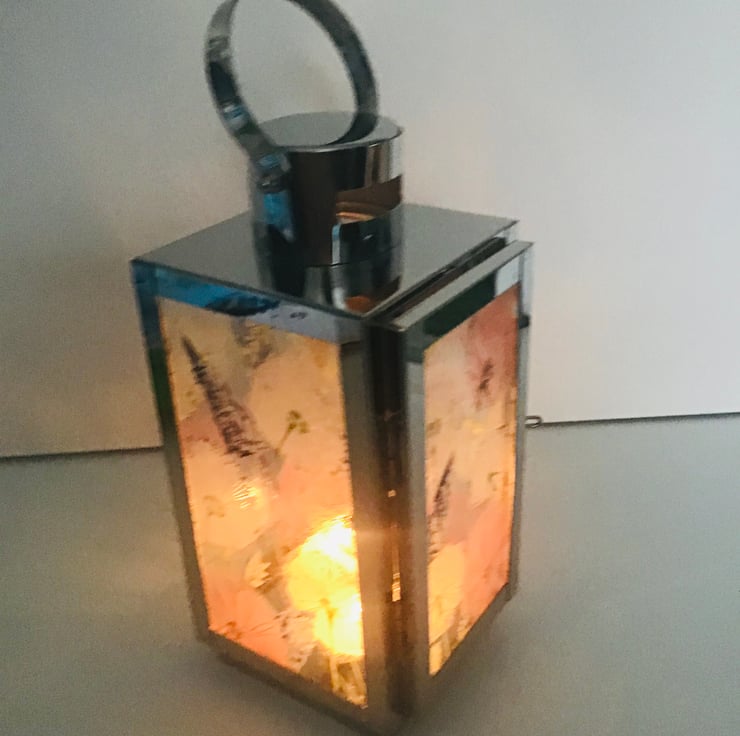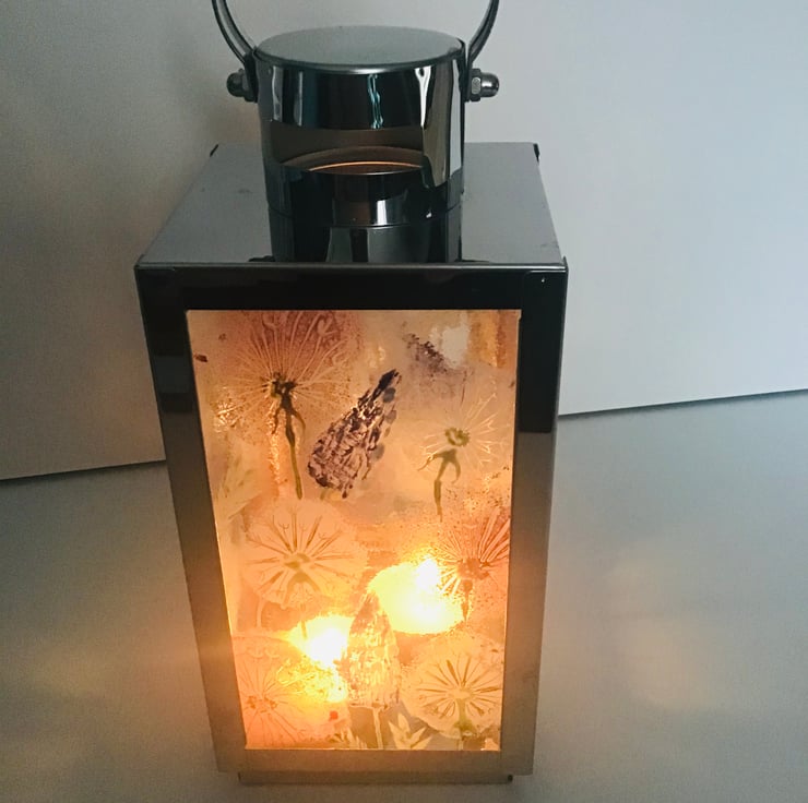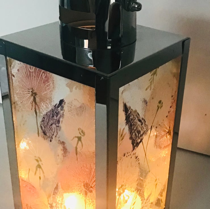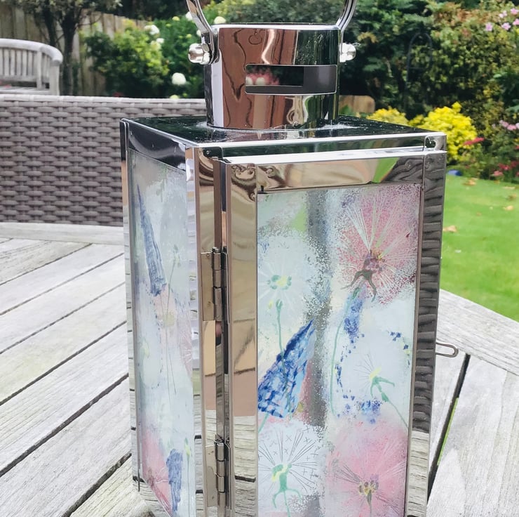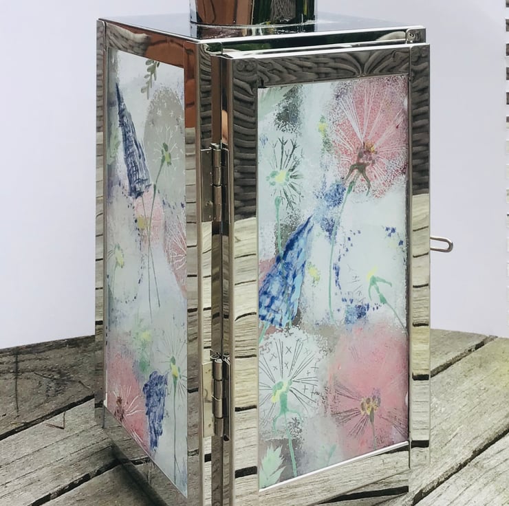 Soft pink blue and white colours created from glass powders to create a very delicate dandelion pattern . Totally unique hand crafted item . The chrome lantern stands approximately 11 inches high x 4 inches wide. . Delicate dandelions and hyacinth in soft colours .