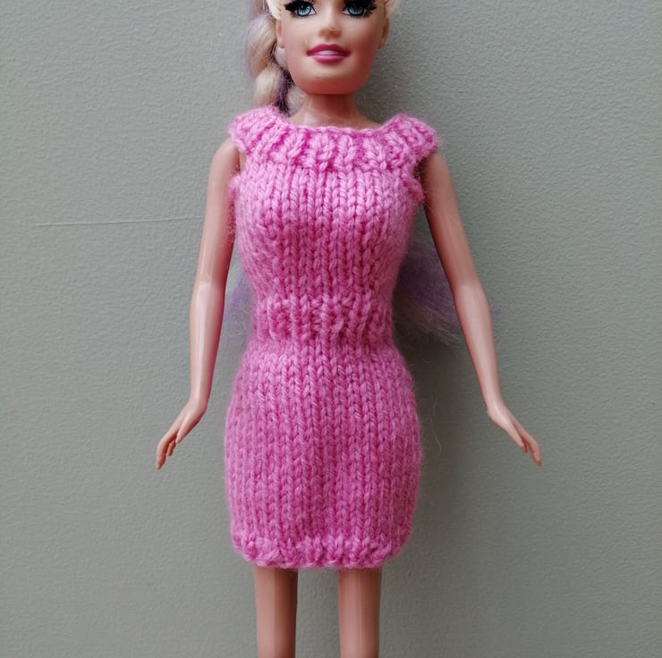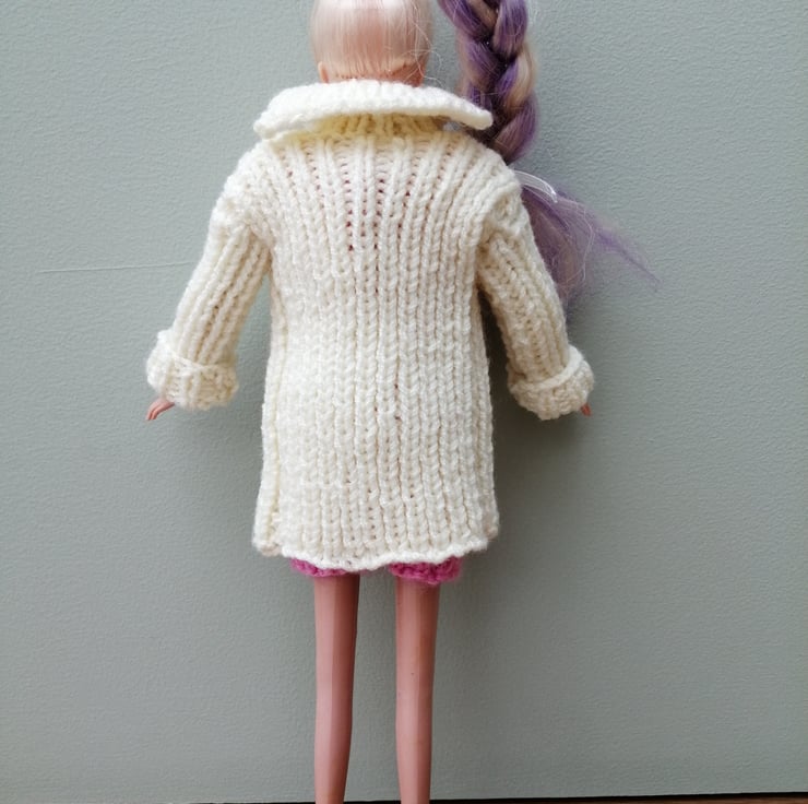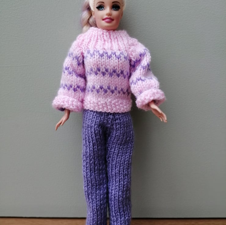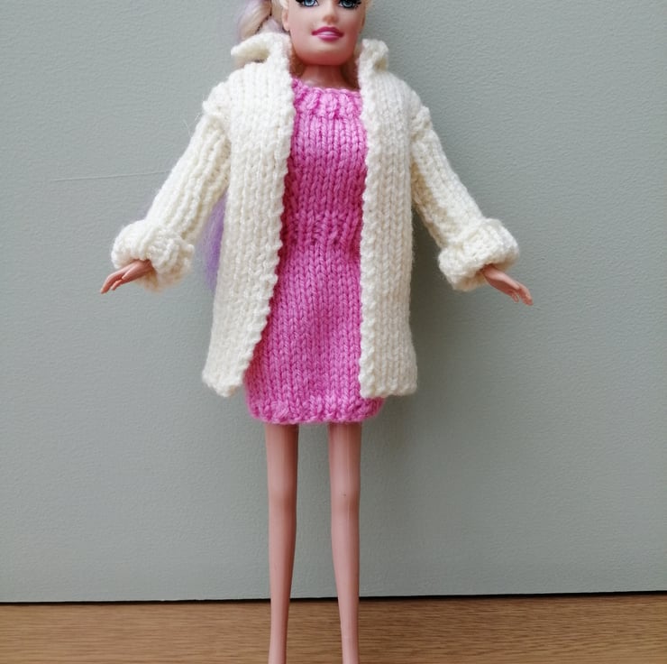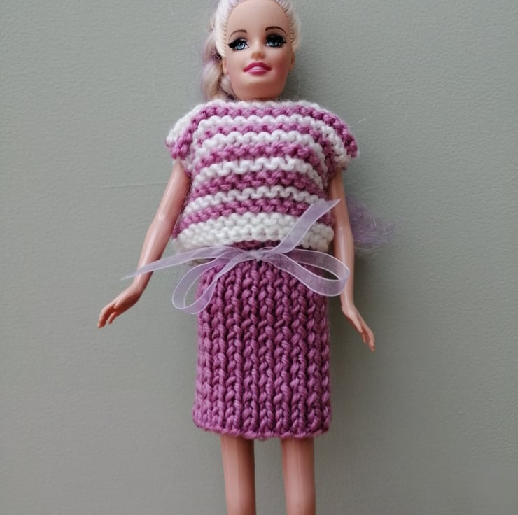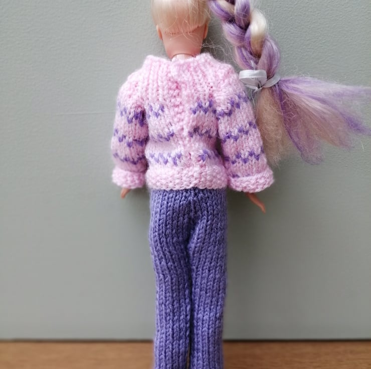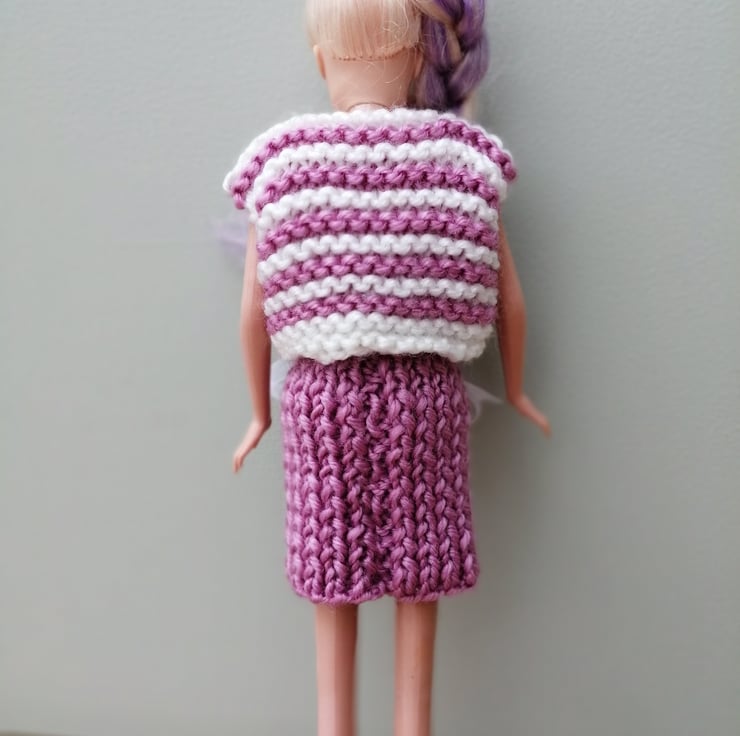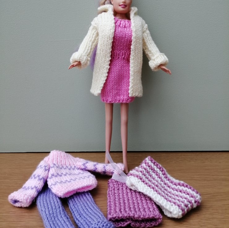 A set of 6 hand knitted items for a teenage Barbie style doll.