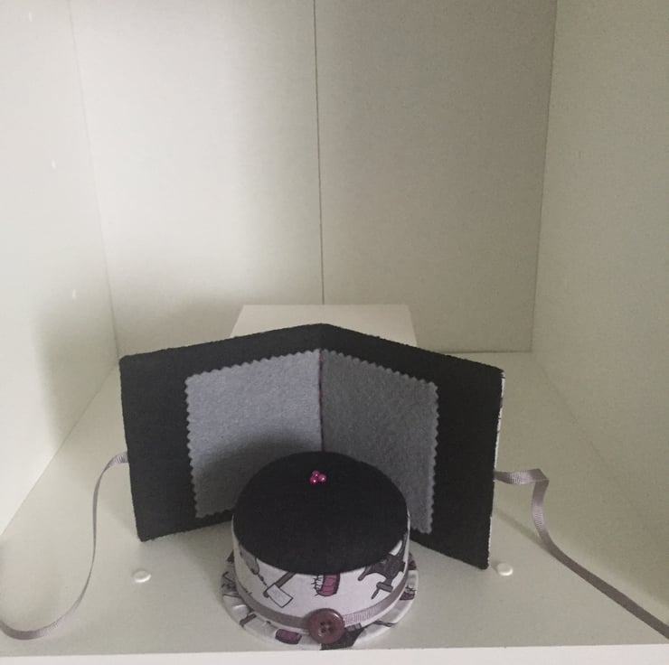 The pincushion has a firm recycled cardboard round base covered with a ‘sewing machine’ themed cotton. This has a silver grey ribbon trim with a toning maroon button. The pincushion part is made from black felt stuffed with fibrefill and fixed firmly into the cardboard base.