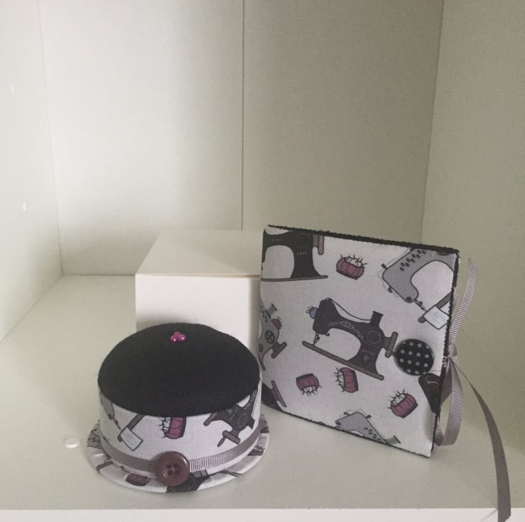 A handmade pincushion and needlebook set. All pieces are individually hand cut.