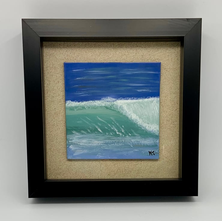 Framed Square Hand painted Enamel Wave seascape on glass.