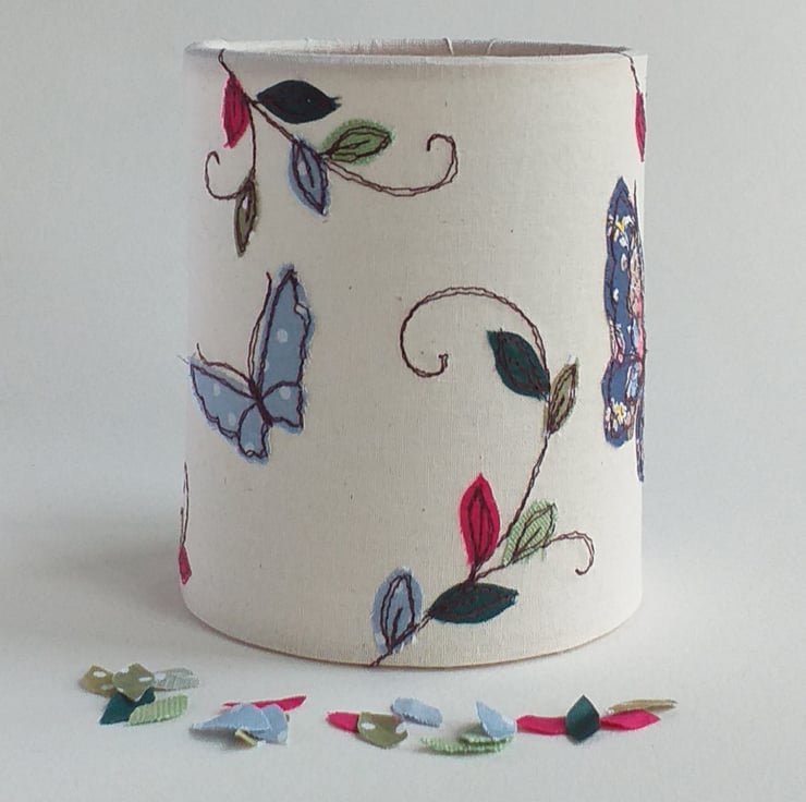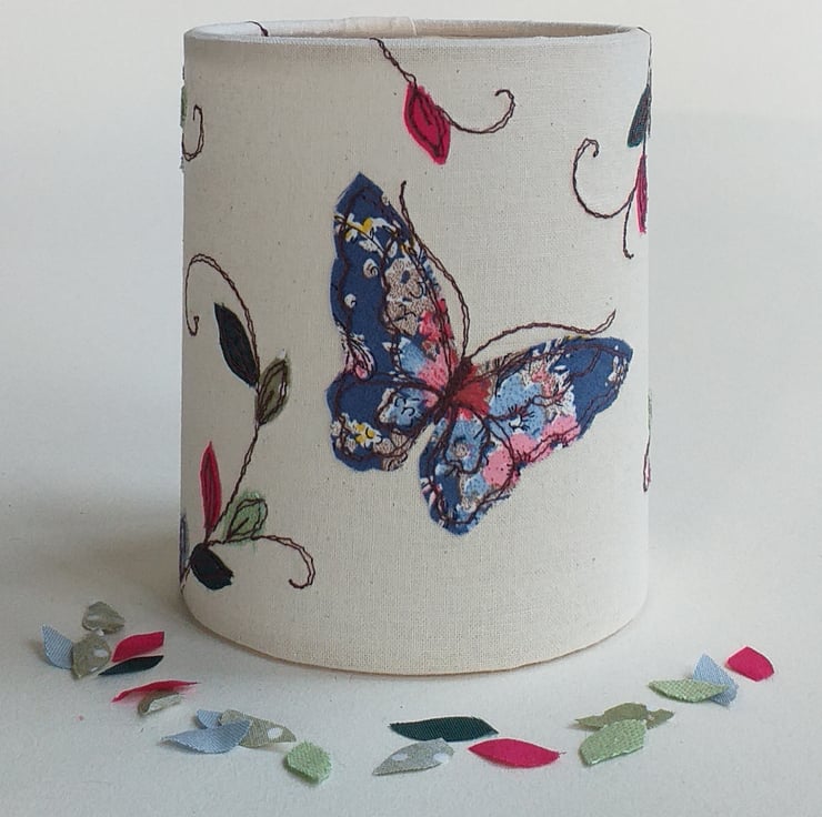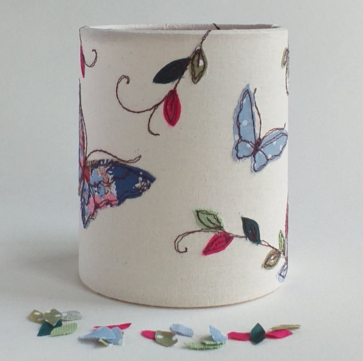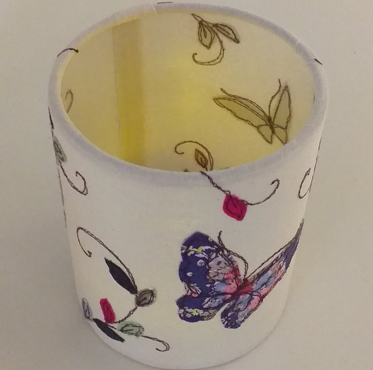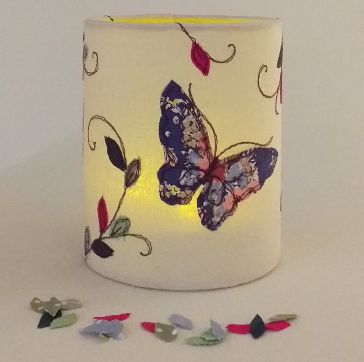This beautiful cream lantern features butterflies and leaves. The design is done in freestyle machine embroidery using appliqued fabric scraps.